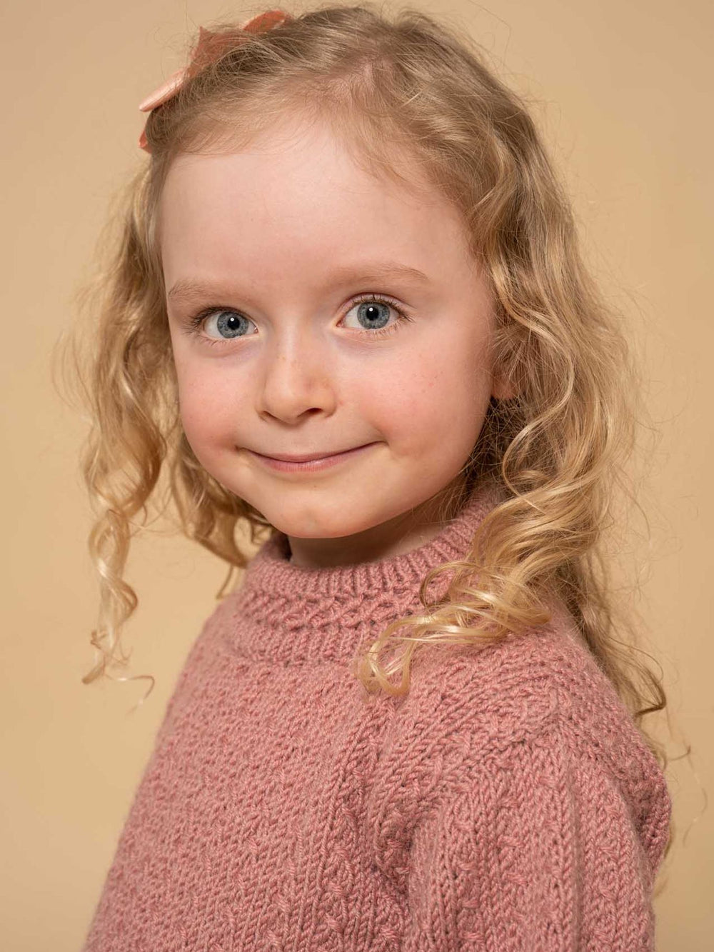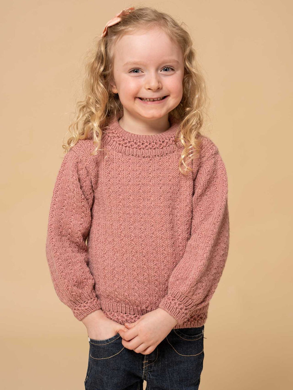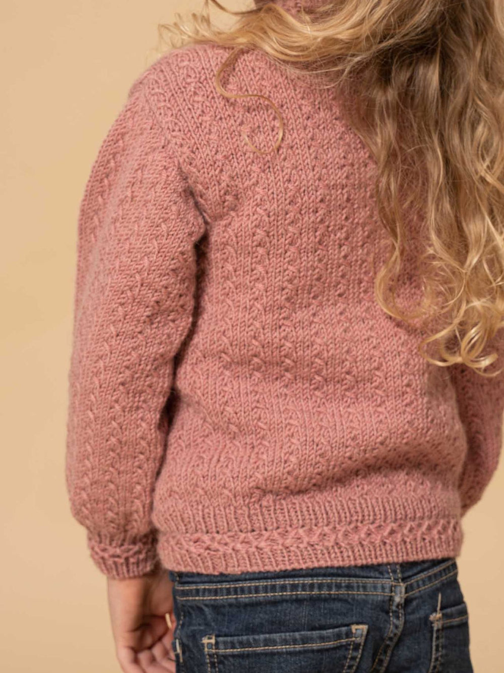 Ulla Sweater Junior strikkes i Mayflower Baby Alpaca. Kombinationen af alpaca og polyamid giver en varm, åndbar og slidstærk sweater, som føles superblød på den sarte barnehud.