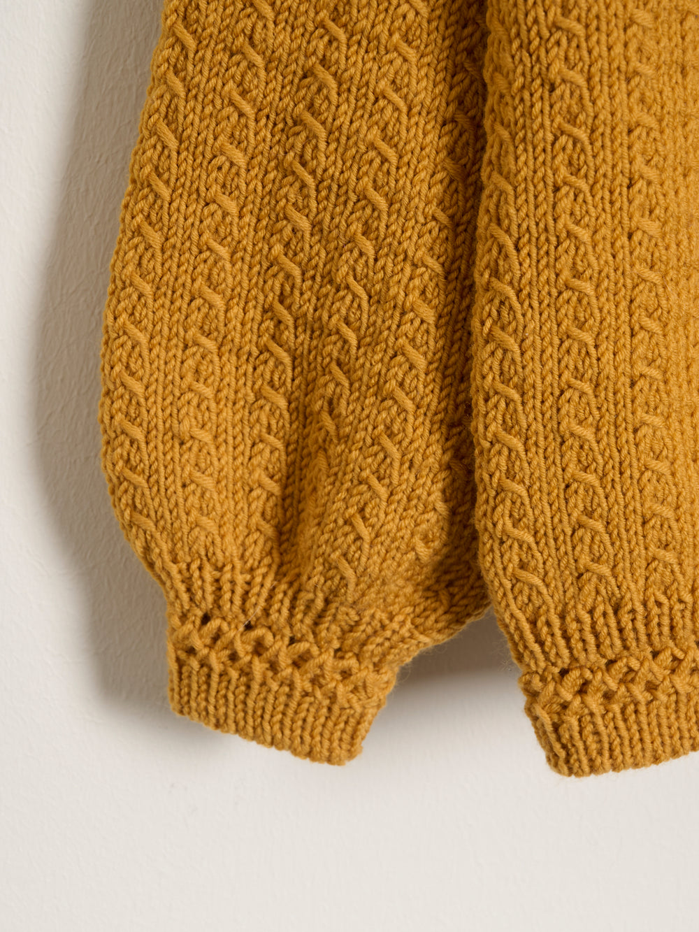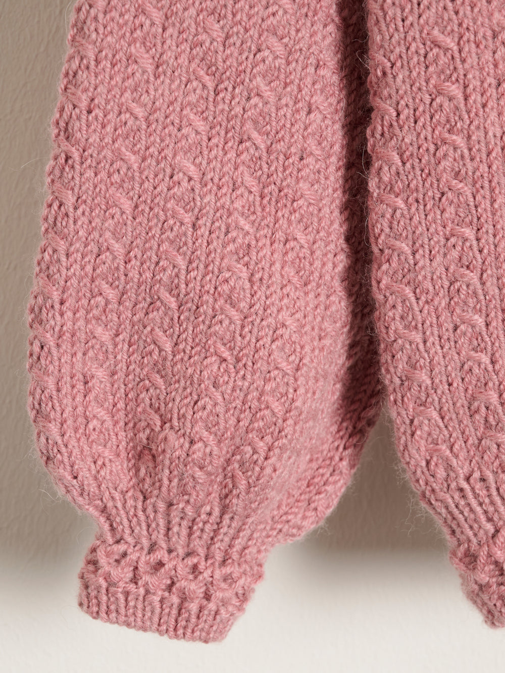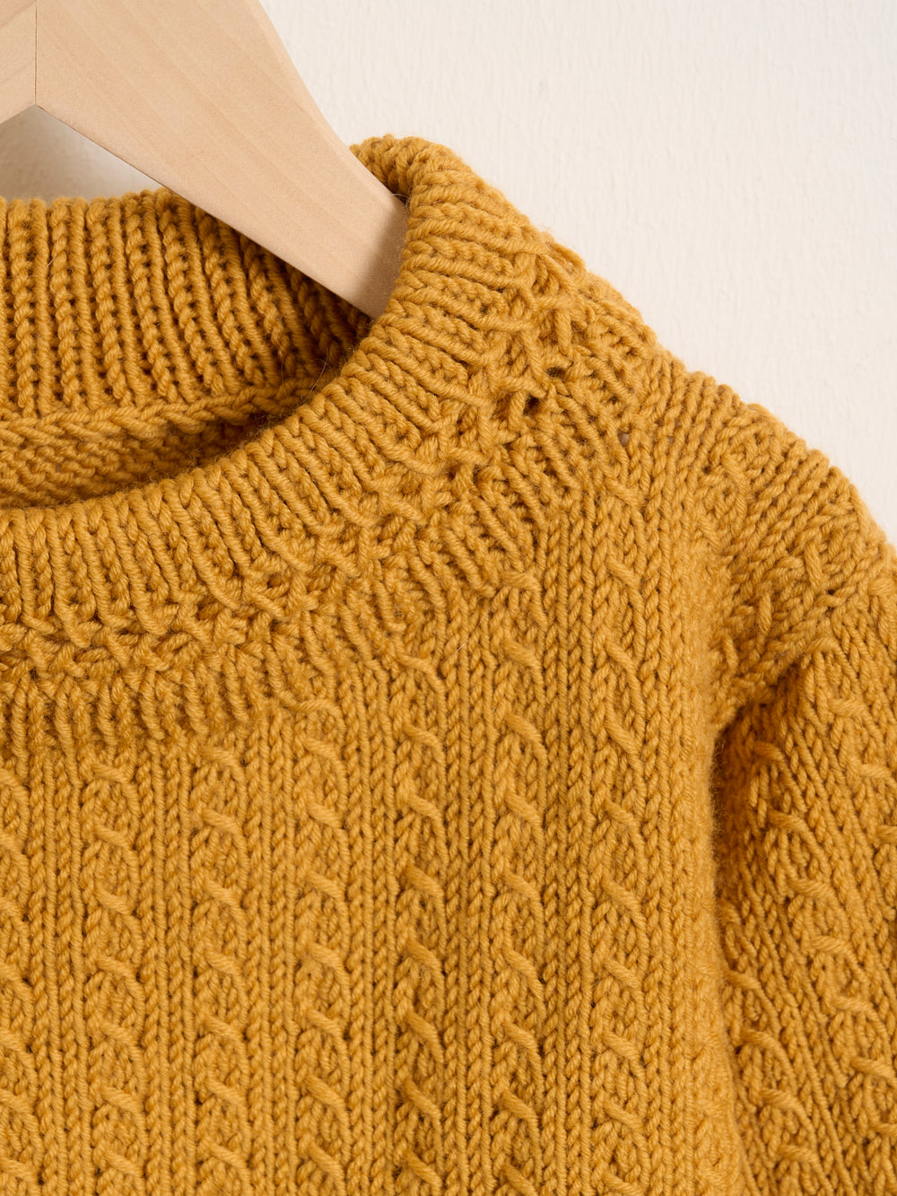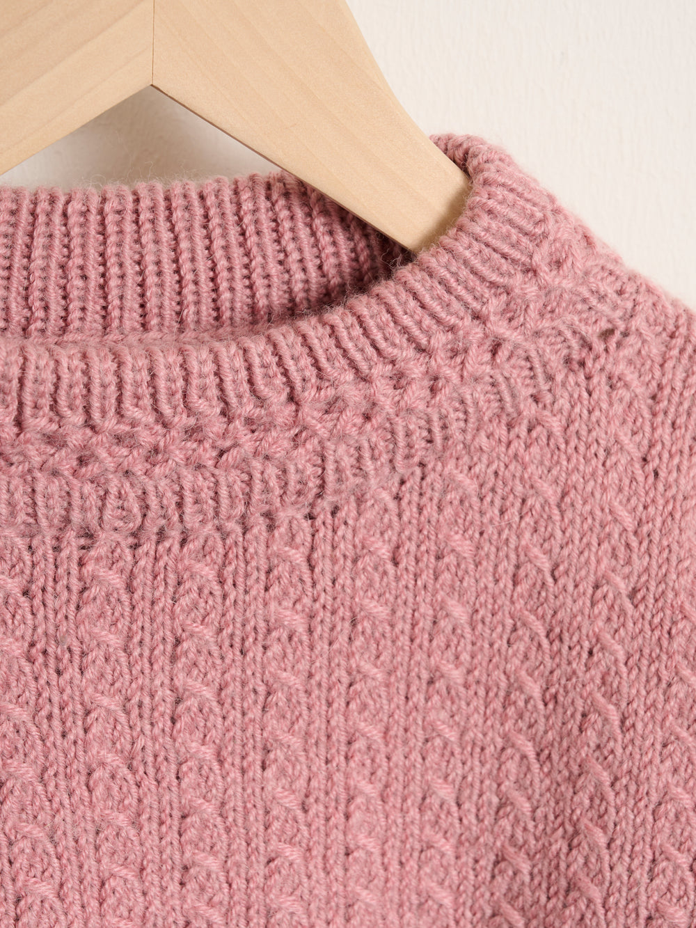 Ulla Sweater Junior strikkes i Mayflower Baby Alpaca. Kombinationen af alpaca og polyamid giver en varm, åndbar og slidstærk sweater, som føles superblød på den sarte barnehud.