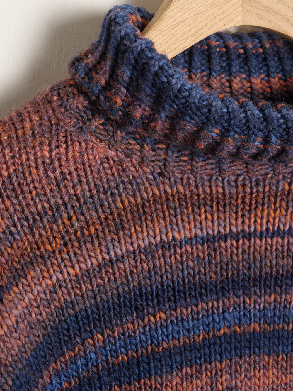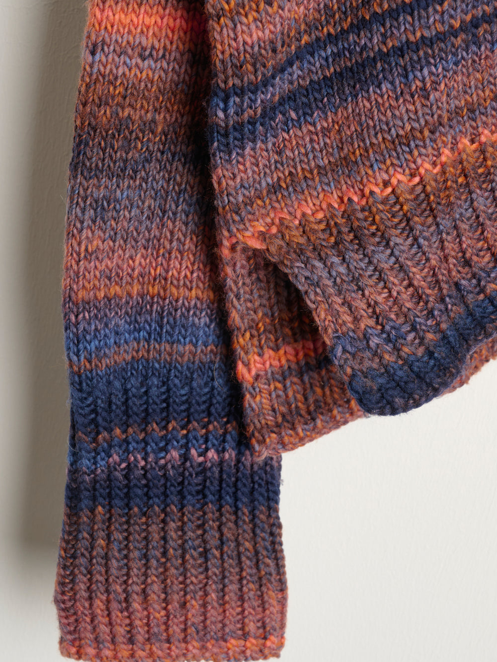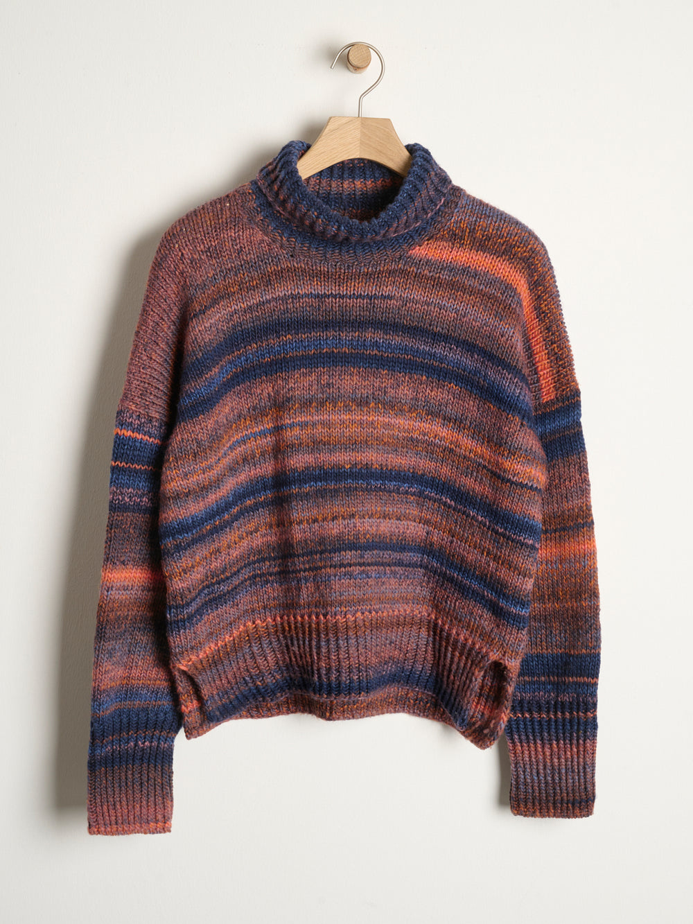 Strikket i det lune og vamsede Mayflower Premium Maxima bliver Wednesday sweateren virkelig dejlig og blød, og det farveskiftende garn sørger for et flot farvespil.