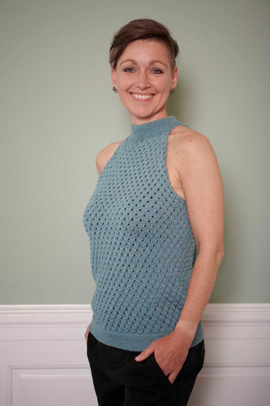 Frigga Nr. 4 ist ein anfängerfreundliches Muster für ein schönes und weiches T-Shirt, das in einem dezenten Strukturmuster gestrickt wird. Das T-Shirt hat einen V-Ausschnitt und gerippte Ränder. Das Muster wird von unten nach oben in einem schönen Garn rund gestrickt, so dass ein T-Shirt entsteht, das das ganze Jahr über getragen werden kann.