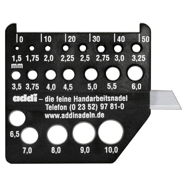 Dieser handliche Nadelmesser von Addi ist perfekt, um schnell und präzise Stricknadeln in verschiedenen Größen zu messen. Zusätzlich verfügt er über ein kleines, scharfes Messer, das sich ideal zum Durchtrennen von Fäden eignet. Ein praktisches Werkzeug für jeden Stricker oder Häkler.