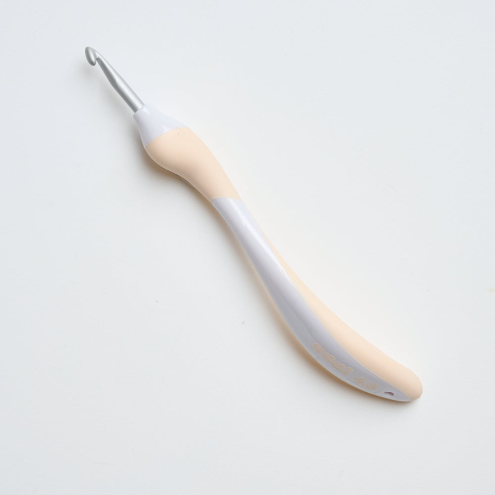 Der Griff besteht aus zwei verschiedenen Kunststoffarten – einer weichen, farbigen und einer weißen, festen. Diese Kombination sorgt für große Flexibilität und ein optimales Griffgefühl beim Häkeln.