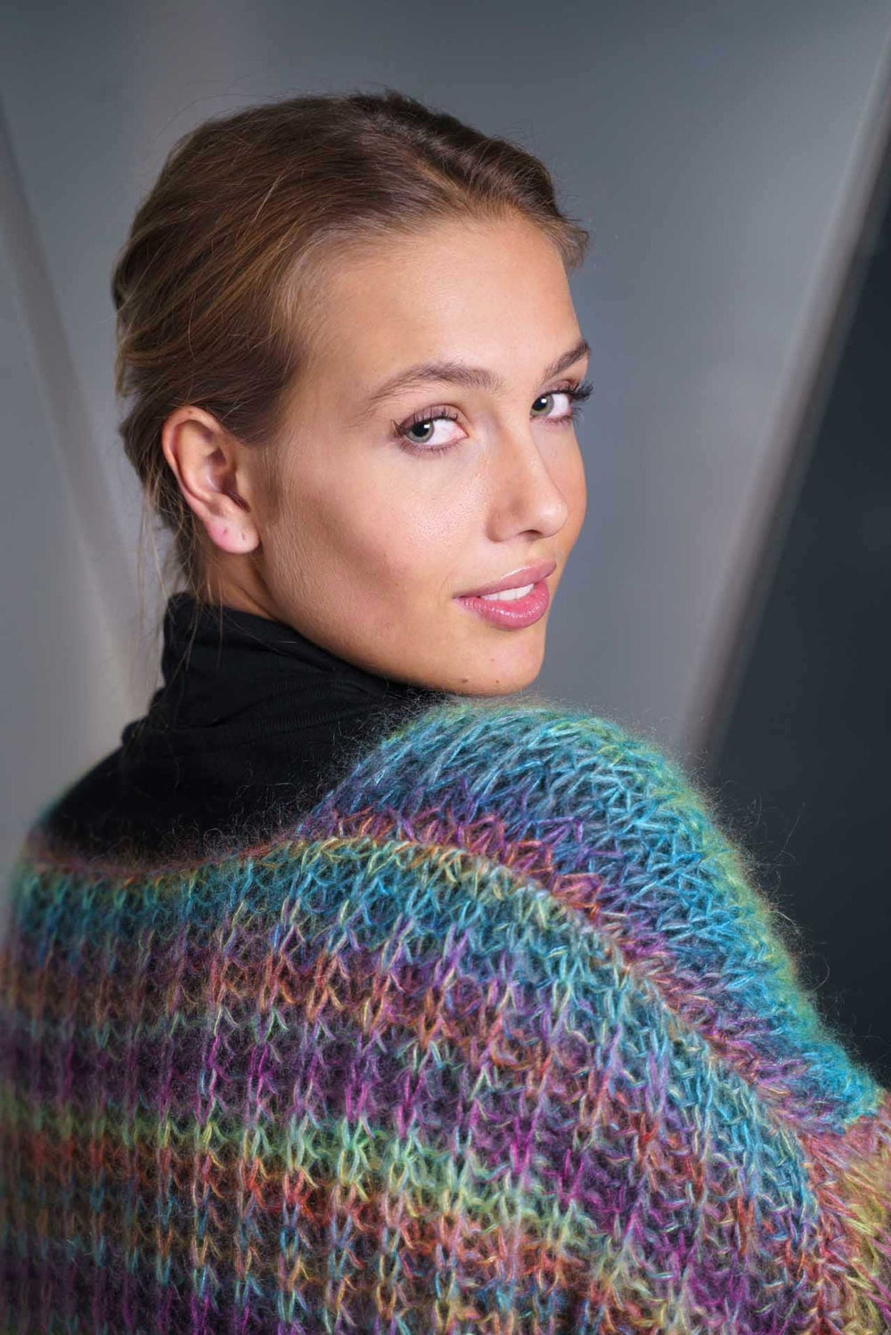 Wenn Sie eine solide farbige Version von Andrea Cardigan wünschen, können Sie sie mit drei Strängen unseres festen farbigen Strähnens stricken Super Kid Silk. Hier können Sie entweder drei Threads in derselben Farbe auswählen oder drei verschiedene Farbtöne auswählen, damit die Strickjacke einen leicht blühenden Look erhält.