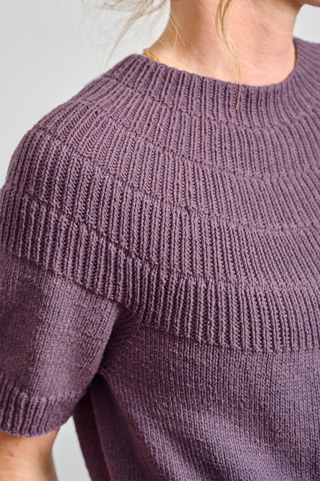 Das Anker Tee von PetiteKnit wird von oben nach unten gestrickt, mit Rippenstruktur im Passe und glatt rechts am Körper.