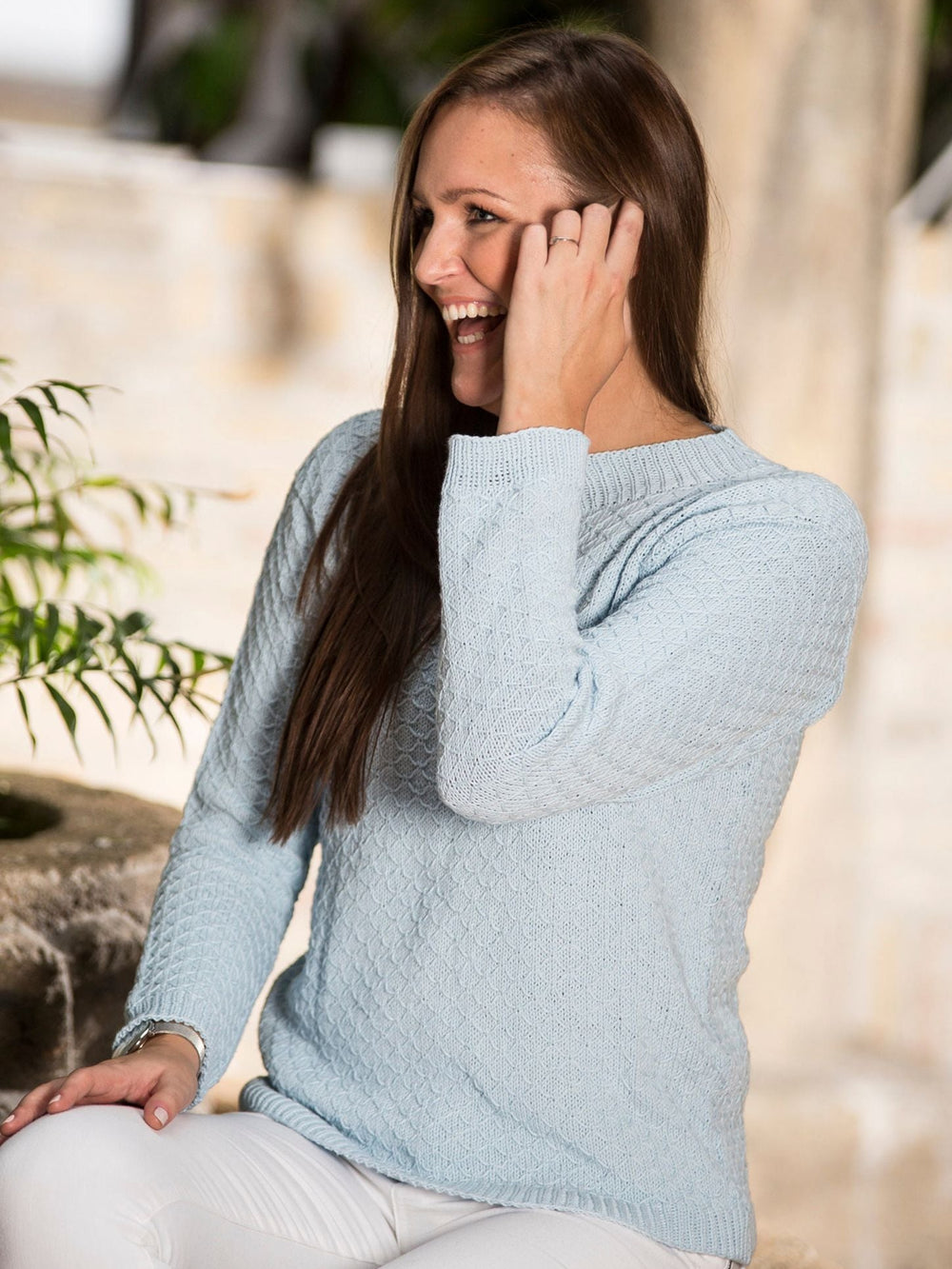 Die Bluse wird in der weichen Mayflower -Baumwolle 8/4 gestrickt, die 100% Baumwollgarn besteht. Baumwolle ist ein weiches und atmungsaktives Garn, das nicht so heiß wird. Daher ist Baumwolle im Sommer gut zu verwenden.