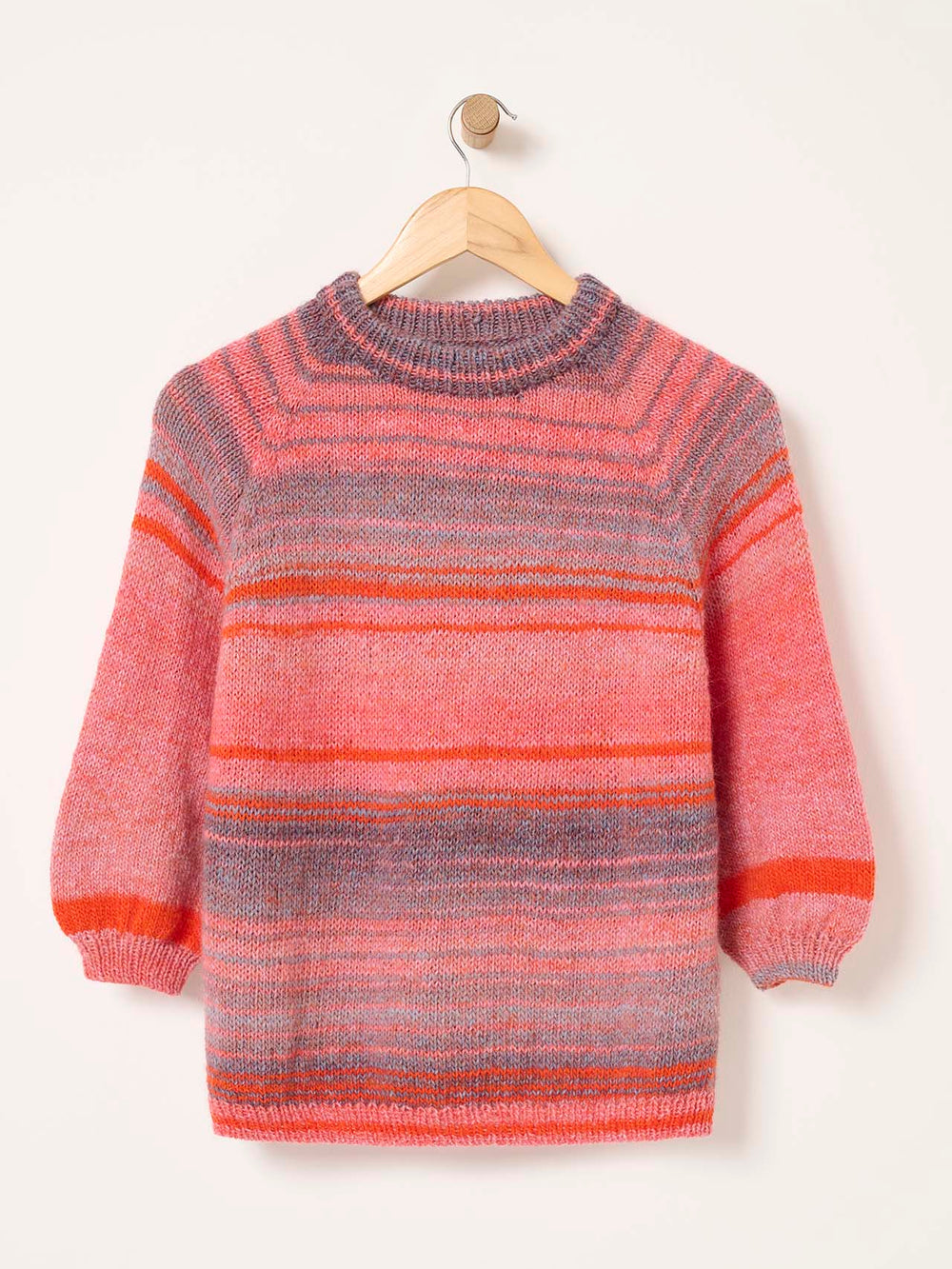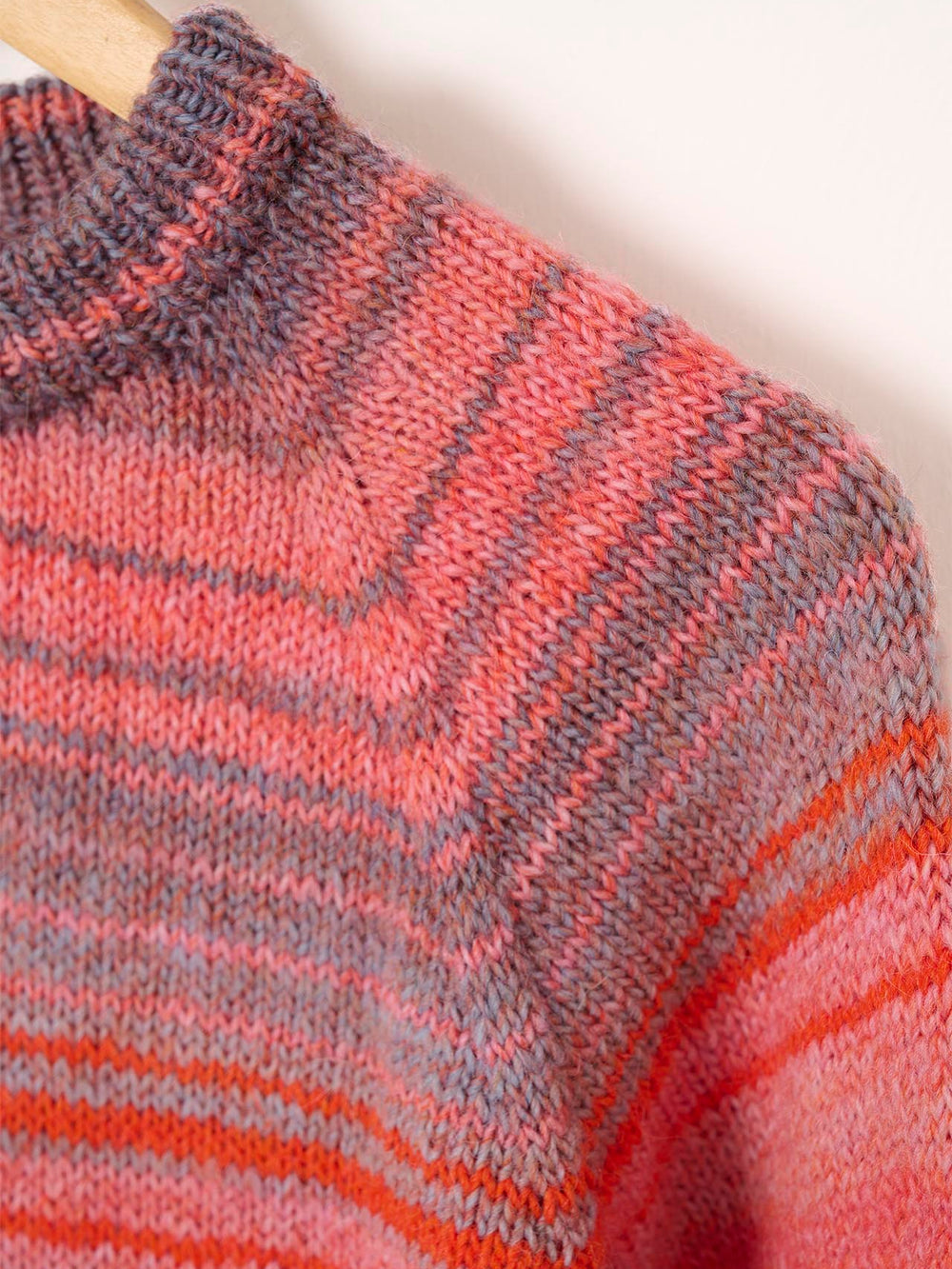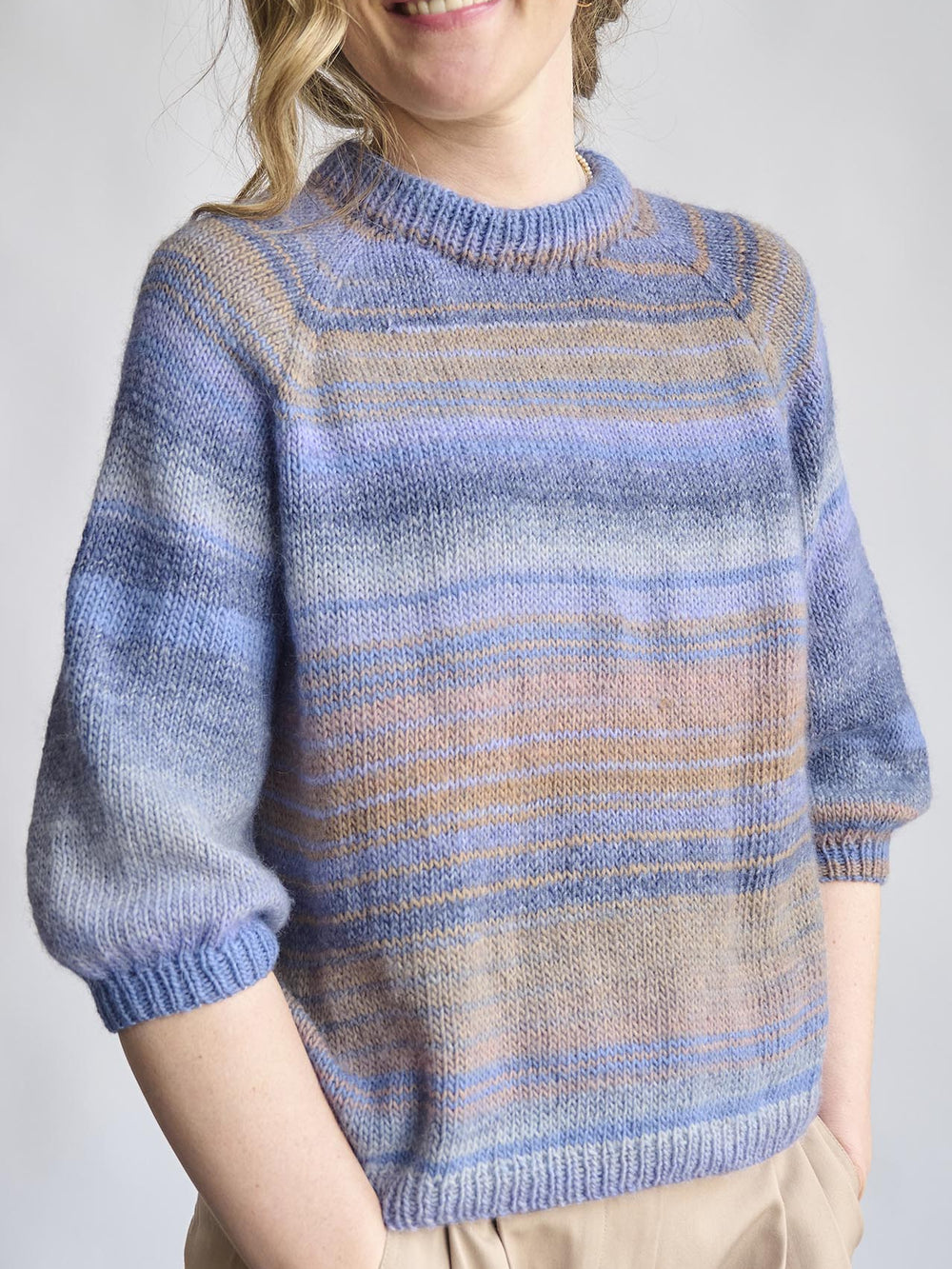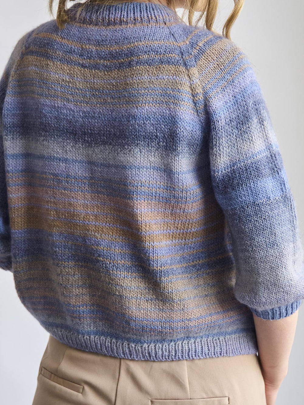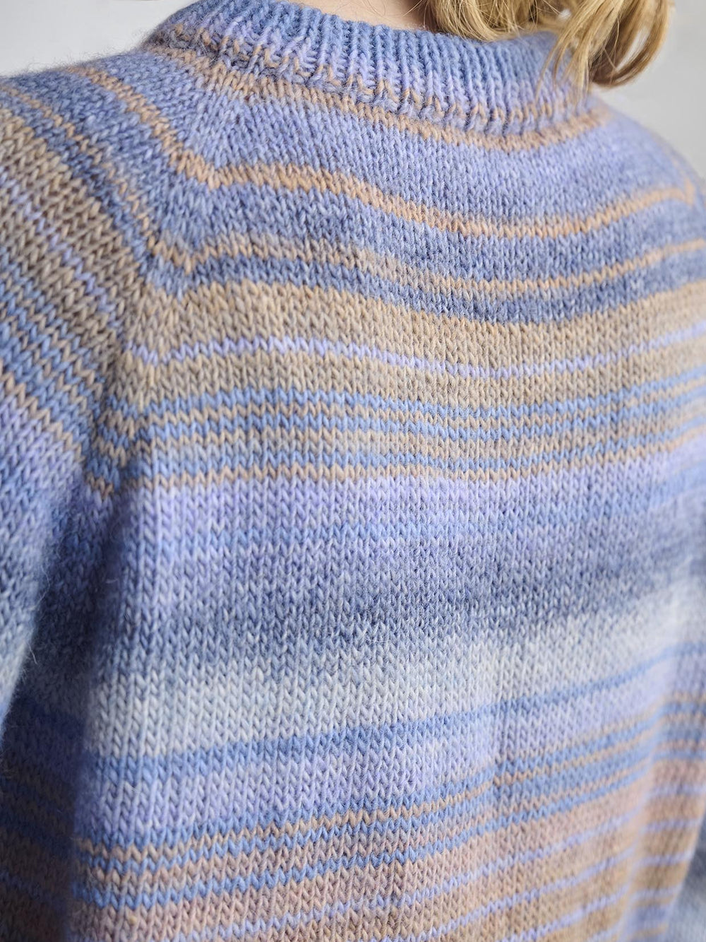 Taormina ist eine weiche Alpaka-Mischung, aber das Garn ist besonders auffällig aufgrund seiner wunderschönen Farben. Wenn du die Anita-Bluse strickst, musst du dir keine Gedanken über Farbwechsel machen, sondern kannst einfach genießen, wie das Garn selbst die schönen Streifen bildet.