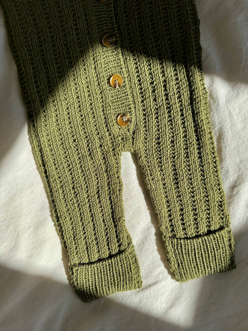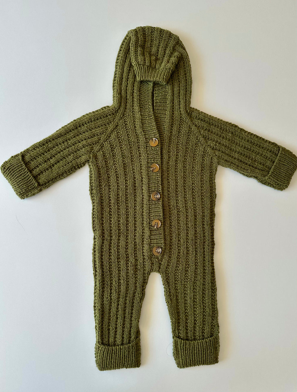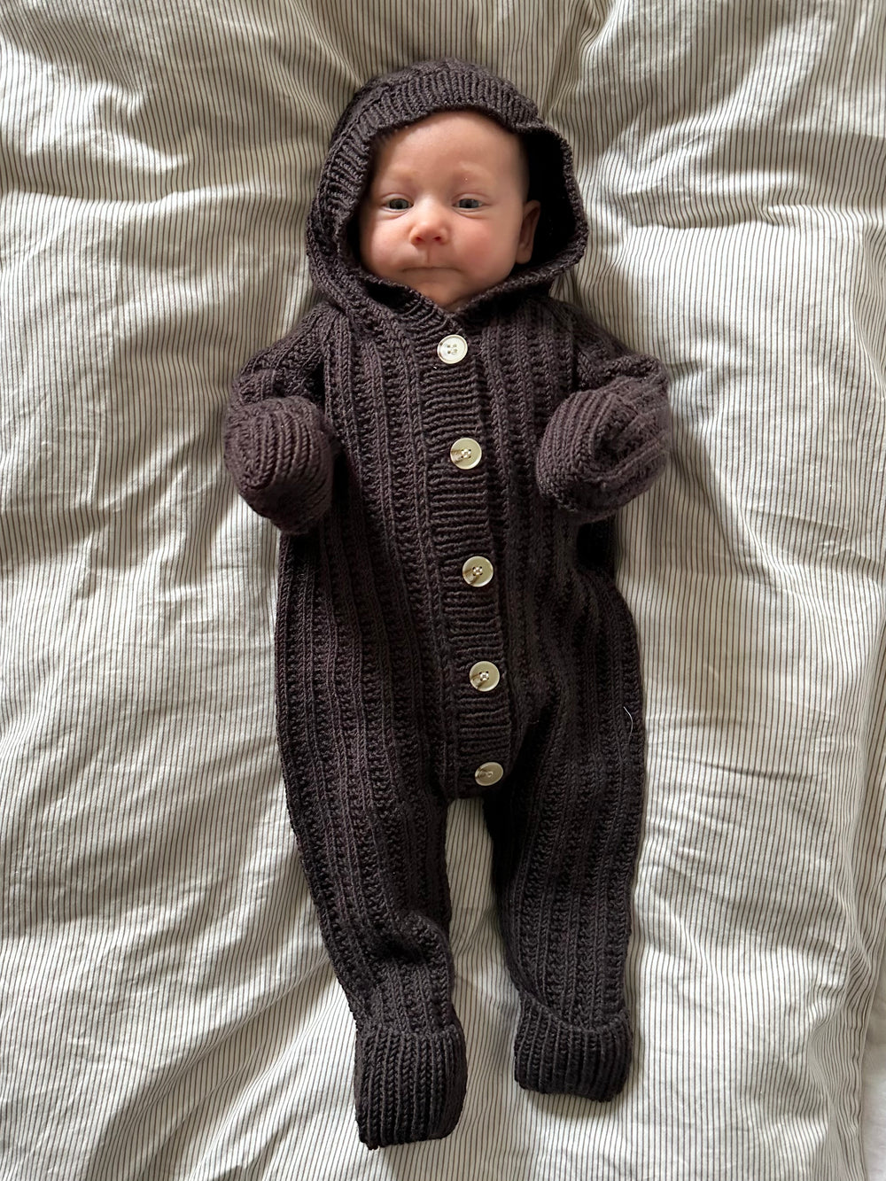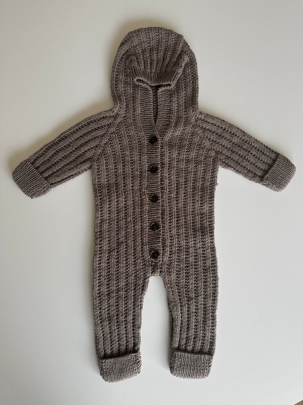 Der Anzug wird von oben nach unten gestrickt mit Kapuze, Raglanärmeln sowie rundgestrickten Beinen und Ärmeln mit Abnahmen. Der Abschluss besteht aus einer Knopfleiste mit Knopflöchern und Knöpfen, und an den Bein- und Ärmelsäumen werden kleine Einsätze eingenäht, um eine optimale Passform zu gewährleisten.