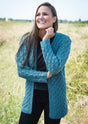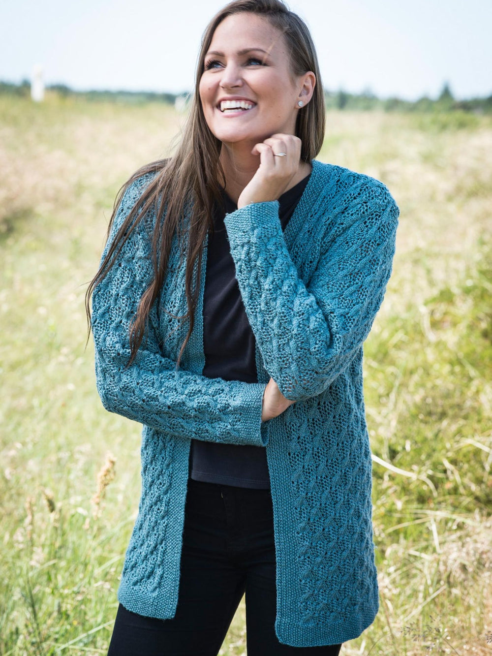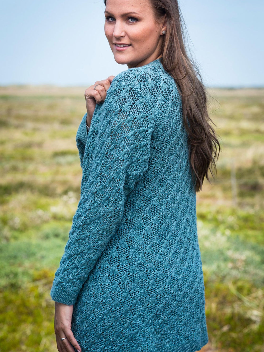 Diese Strickjacke hat das schönste Hohlmuster kombiniert mit Wendungen. Das Muster wird von schönen Kanten des Perlenknits beendet, was dazu beiträgt, dass die Strickjacke noch einzigartiger wird.