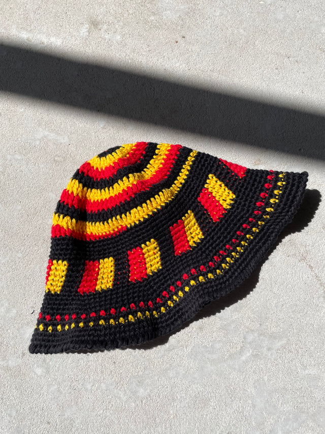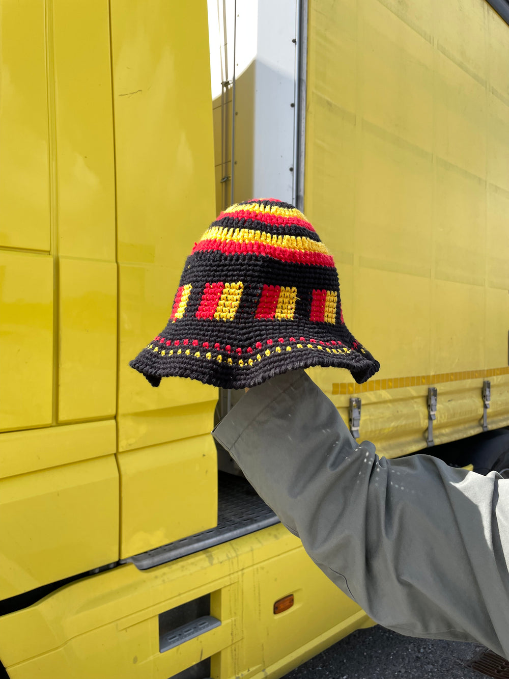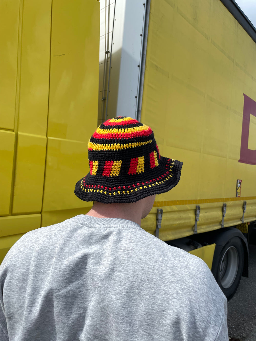 Gehäkelter Fischerhut, der von oben nach unten zum Schirm gehäkelt wird. Der Fischerhut wird mit drei Fäden in Schwarz, Gelb und Rot gehäkelt, sodass die Farbe kontinuierlich gewechselt werden kann, was das Flaggenmuster an den Seiten bildet. Der Fischerhut wird aus dem strapazierfähigen und weichen Mayflower Cotton 8/4 gehäkelt, das in vielen verschiedenen Farben erhältlich ist.