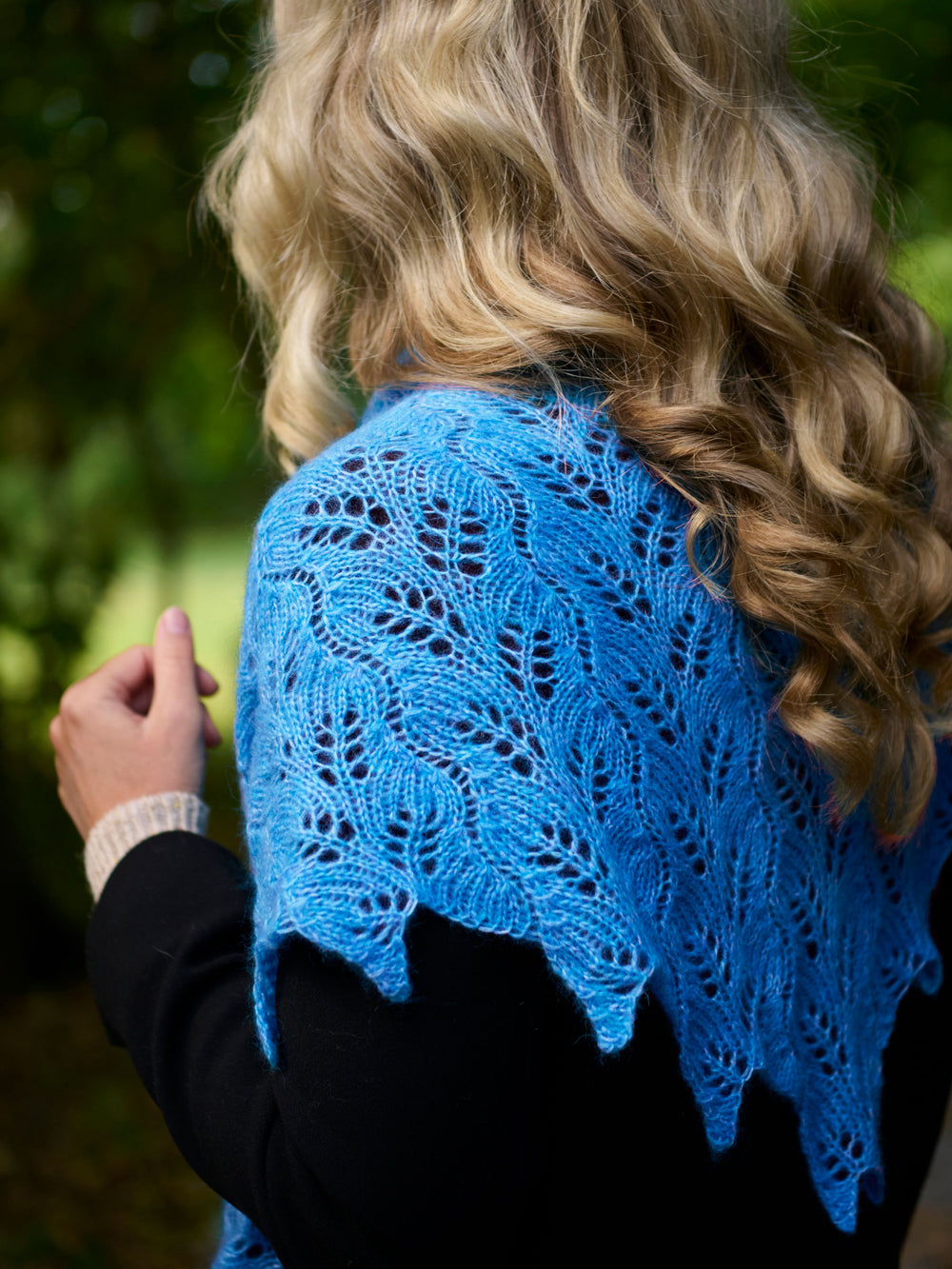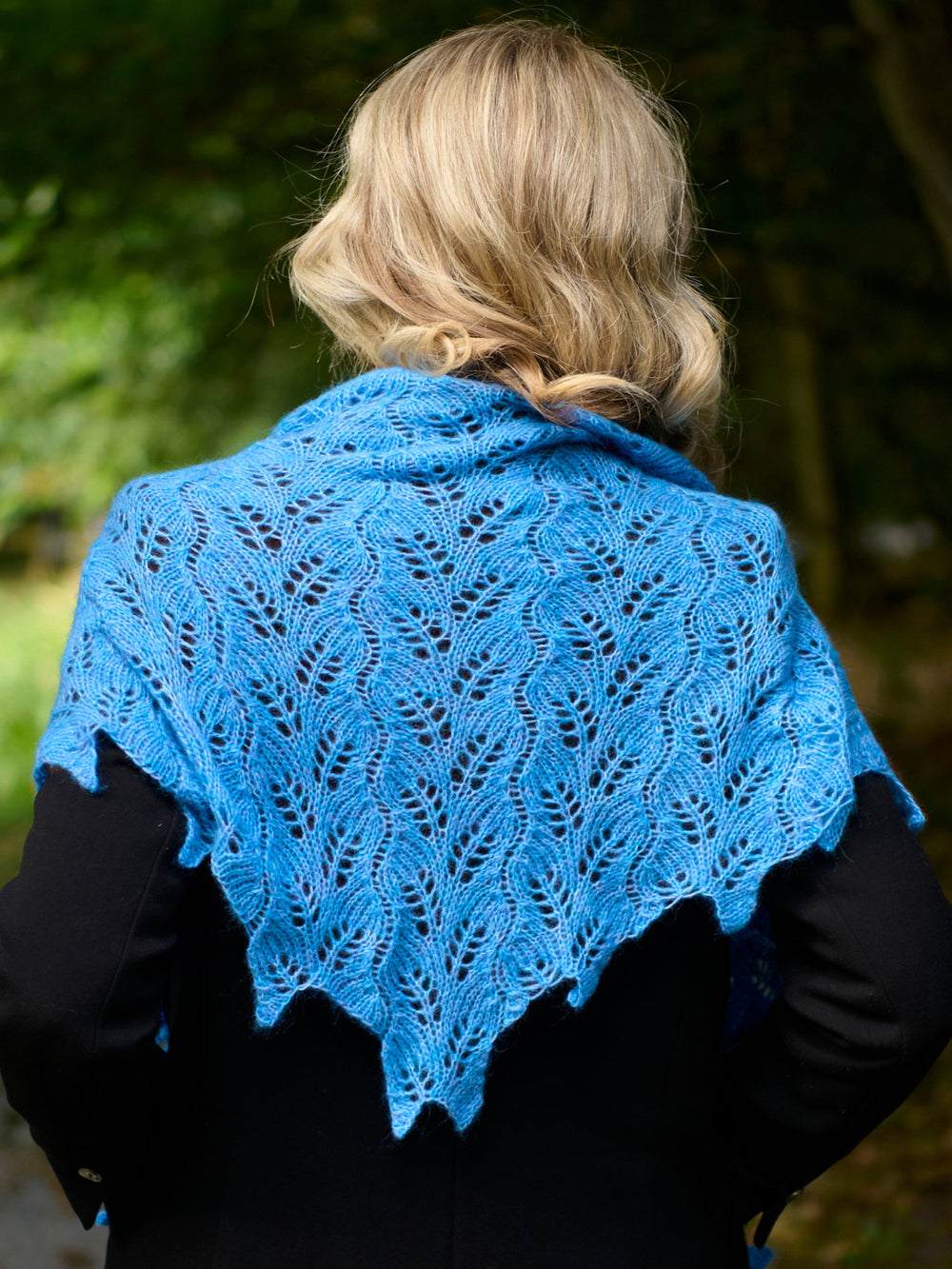 Das Farn-Tuch wurde ursprünglich in Mayflower New Sky Light gestrickt, und du findest das Muster genau hier.