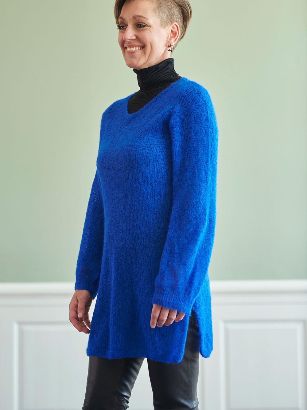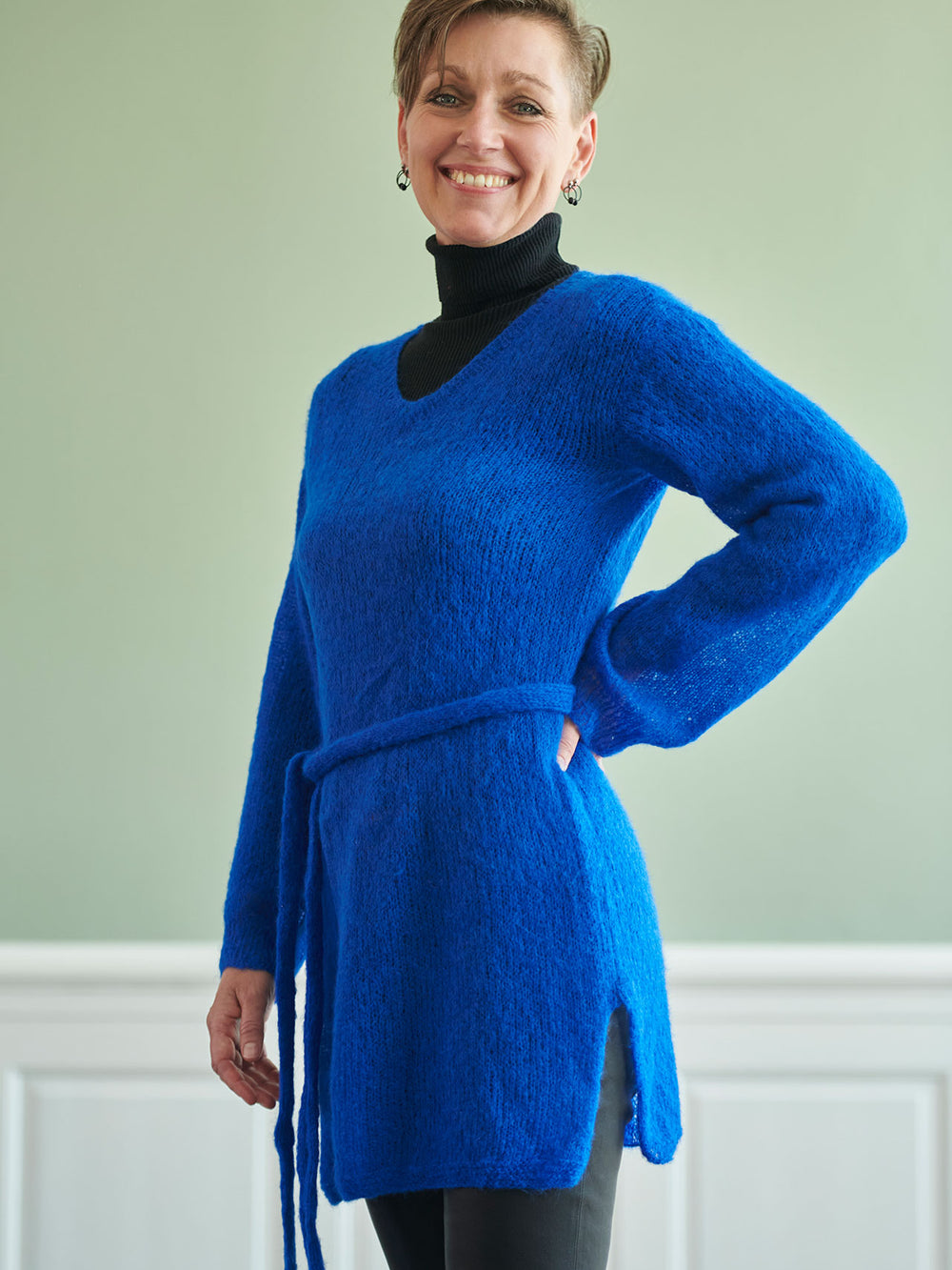 Diese leichte, feine Tunika ist ein elegantes Modell in Ihrer Garderobe, das sich leicht mit Bindeband, großen Stiefeln, Leggings und eventuell einer Weste stylen lässt, sodass Ihr eigenes Handwerk Teil Ihres Layering-Stils sein kann. Diese Tunika wird von unten nach oben gestrickt. Vorderteil und Rücken werden jeweils separat gestrickt, über dem Schlitz zusammengefügt und dann am Armausschnitt wieder getrennt. Die Schultern werden zusammengenäht, bevor der Rippenrand am Hals gestrickt wird. Die Ärmel werden hin und her gestrickt und von der Innenseite an das Modell genäht. Es ist wichtig, dass sowohl eine Naht entlang des Ärmels als auch am Modell vorhanden ist, damit es im Gebrauch nicht nachgibt. Zum Schluss wird ein Bindeband zur Verzierung des Modells gestrickt.