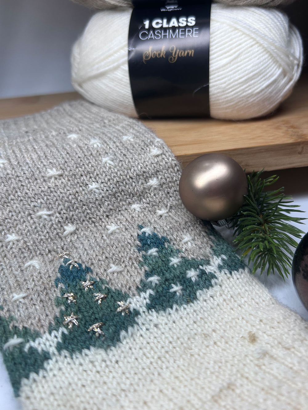 Der Schaft zeigt eine feine Reihe Weihnachtsbäume, ab dem Fuß wird die Socke schlicht in Wollweiß weitergeführt. Nach dem Stricken werden kleine Schneeflöckchen aufgestickt – und wer mag, lässt einige davon in Goldglitzer funkeln.