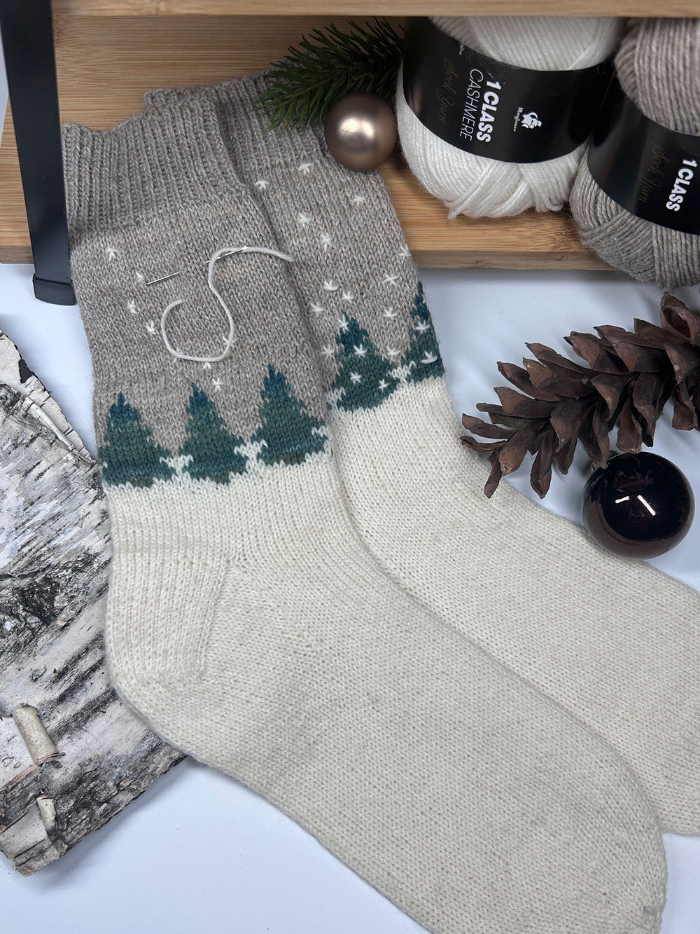 Jetzt wird’s wirklich Zeit, an den Winter zu denken. Mit der Strickanleitung „Winterzauber-Socken“ holst du dir ein Stück nordische Winterruhe auf die Nadeln. Das Design verbindet schlichte Naturtöne – dunkles Beige, Tannengrün und Wollweiß – zu einem klaren, zeitlosen Muster.