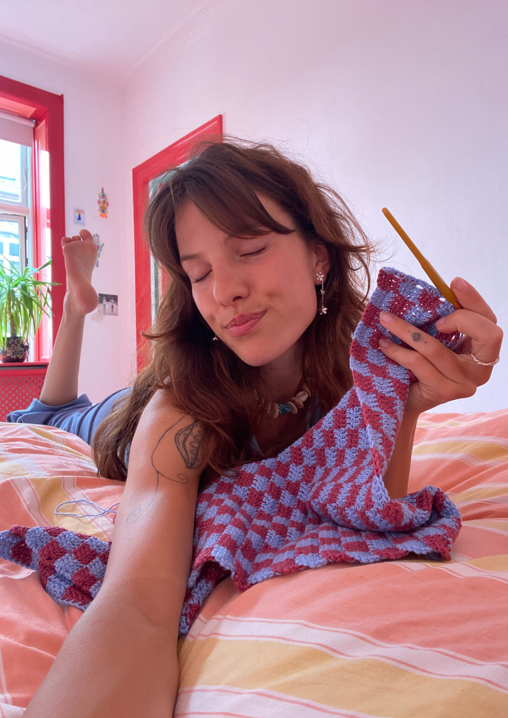 Häkeln Sie ein Set für die Küche bestehend aus einem Spültuch und einem Geschirrtuch, die beide in einem karierten Design sind.