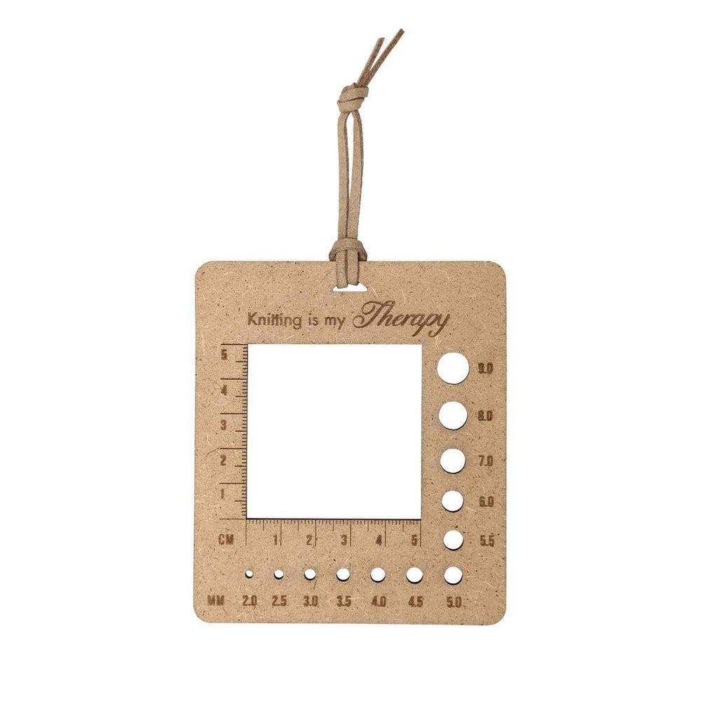 Quadratisches Strickwerkzeug aus Holz, das mehrere Funktionen hat und zum Messen der Strickspannung und der Nadelstärke verwendet werden kann.