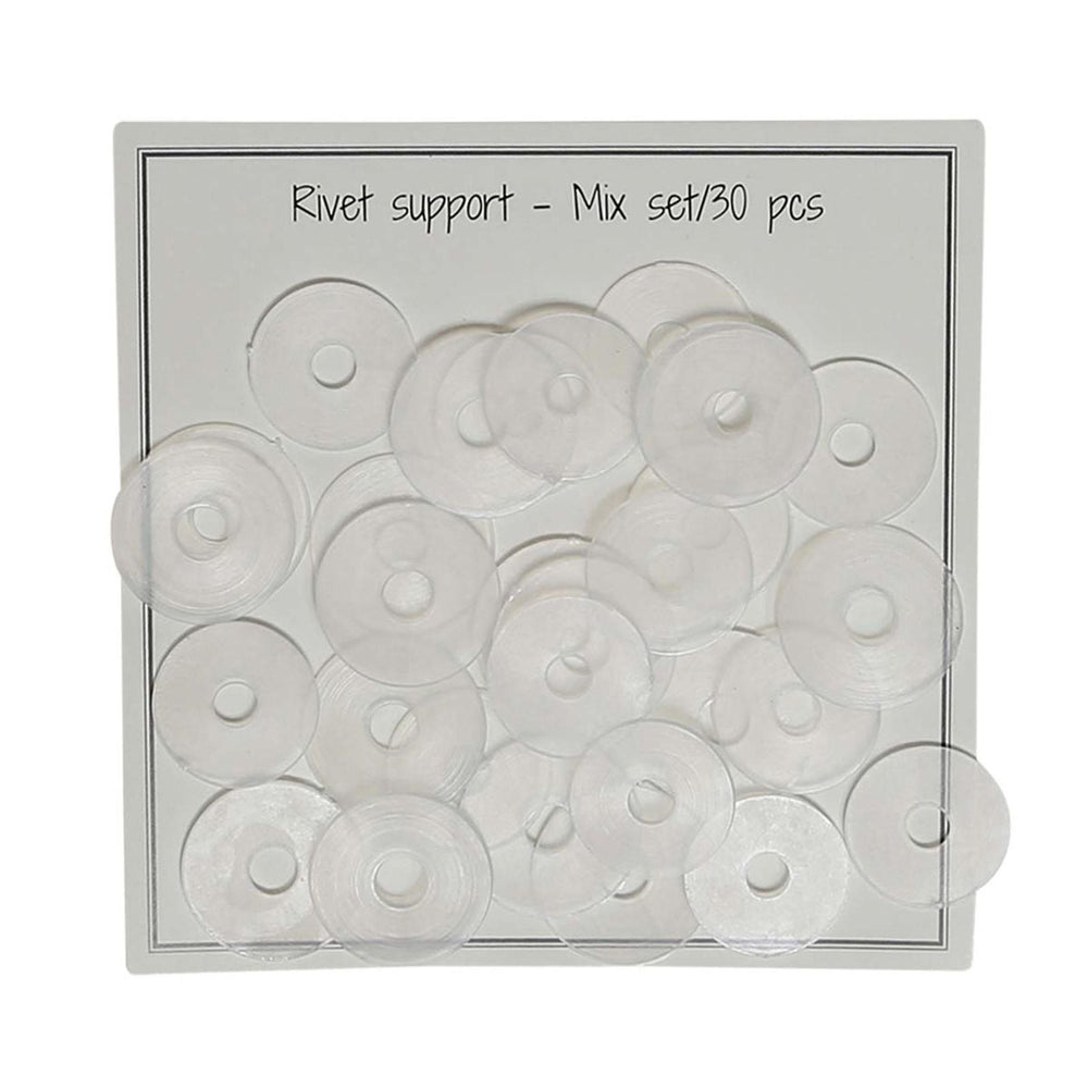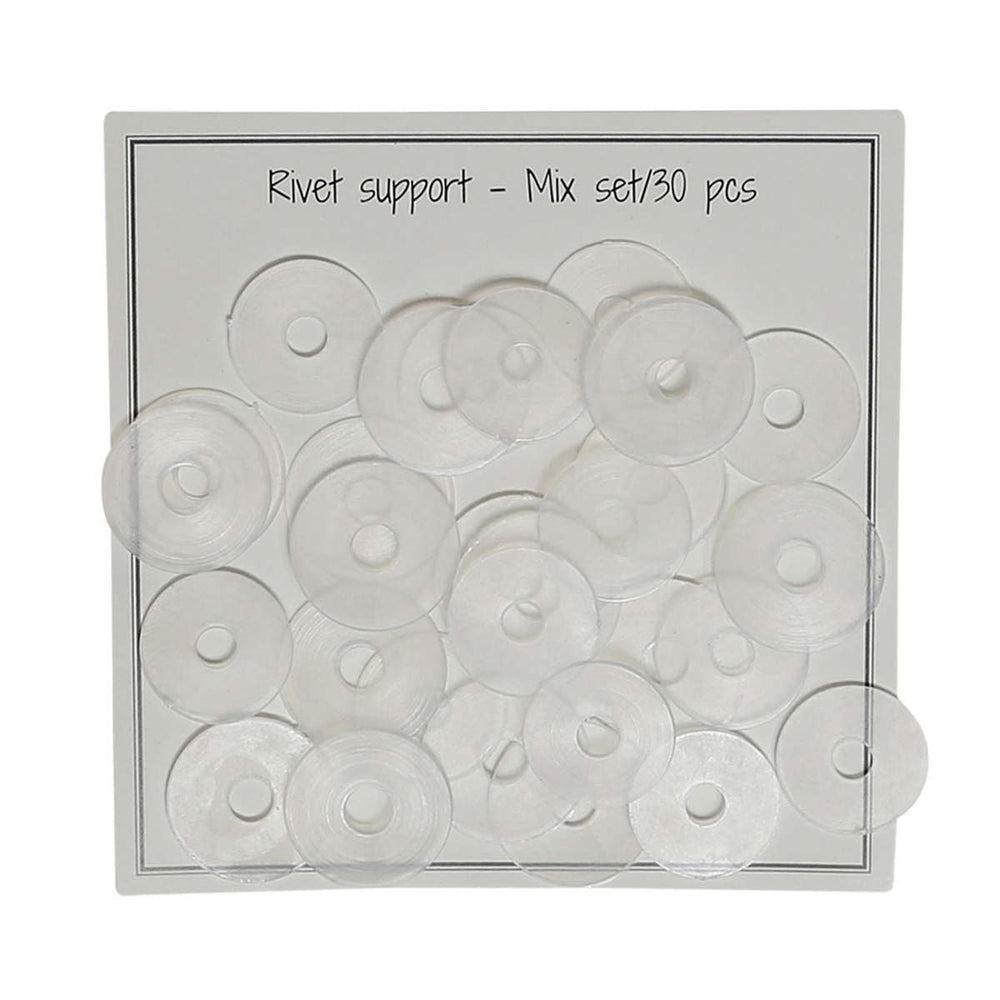 Ein Satz runder Kunststoff-Stützscheiben, die hinter den Nieten platziert werden, um sicherzustellen, dass sie nicht durch das Werkstück gehen und korrekt installiert werden können. Das Set enthält insgesamt 30 Stützscheiben mit einem Durchmesser von 16 und 18 mm.