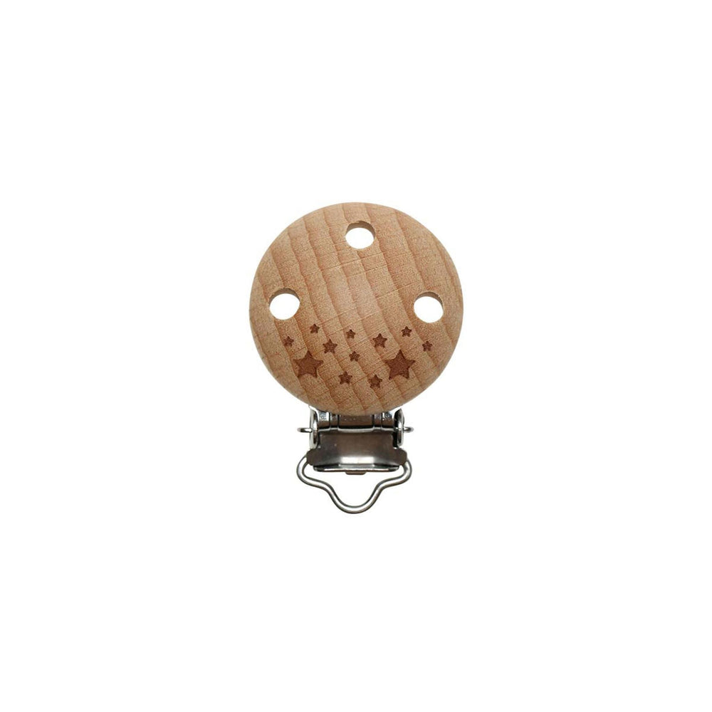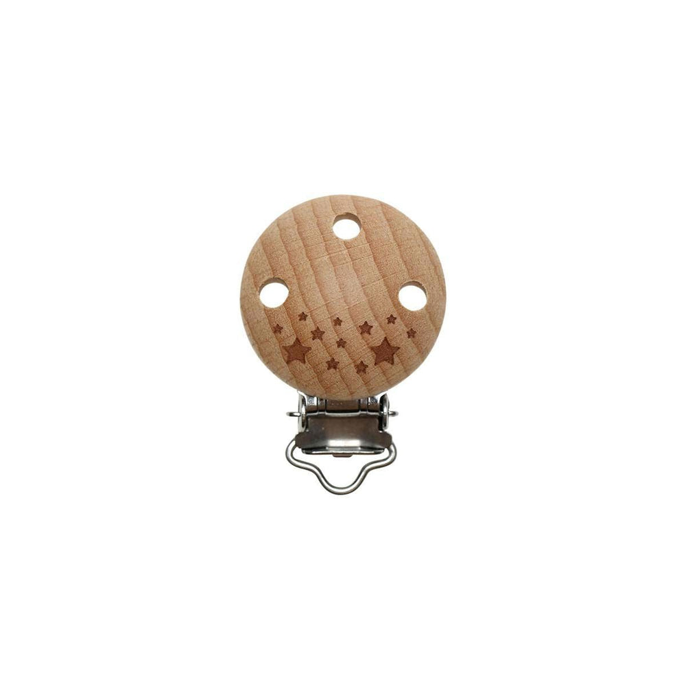 Runde Schnullerclips aus Holz, der Schnullerclip hat 2 Belüftungslöcher und ist daher für die Verwendung in Schnullerketten zugelassen. Der Schnullerclip hat einen Durchmesser von 30 mm. Der Clip selbst ist aus Metall und Kunststoff gefertigt.