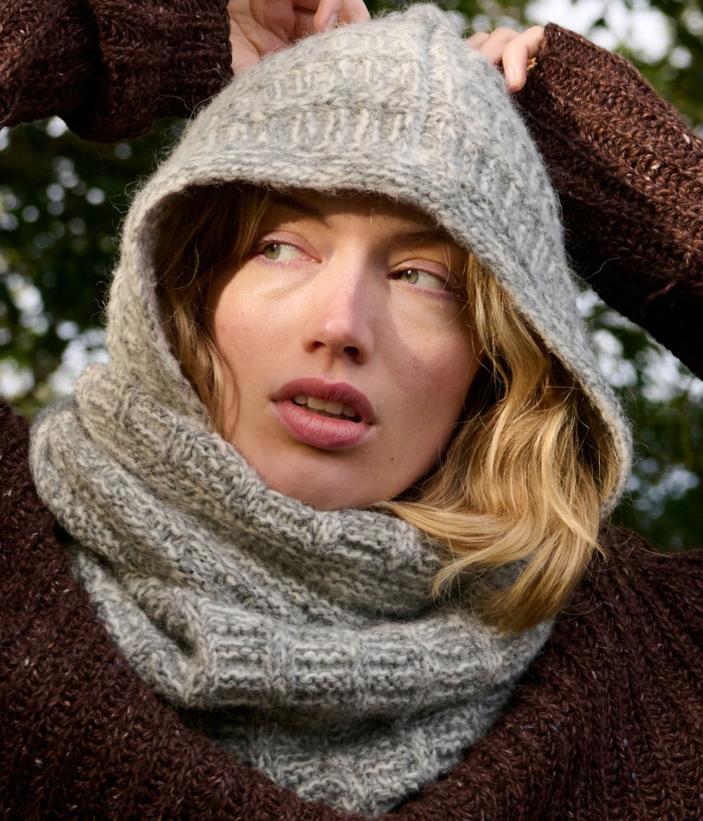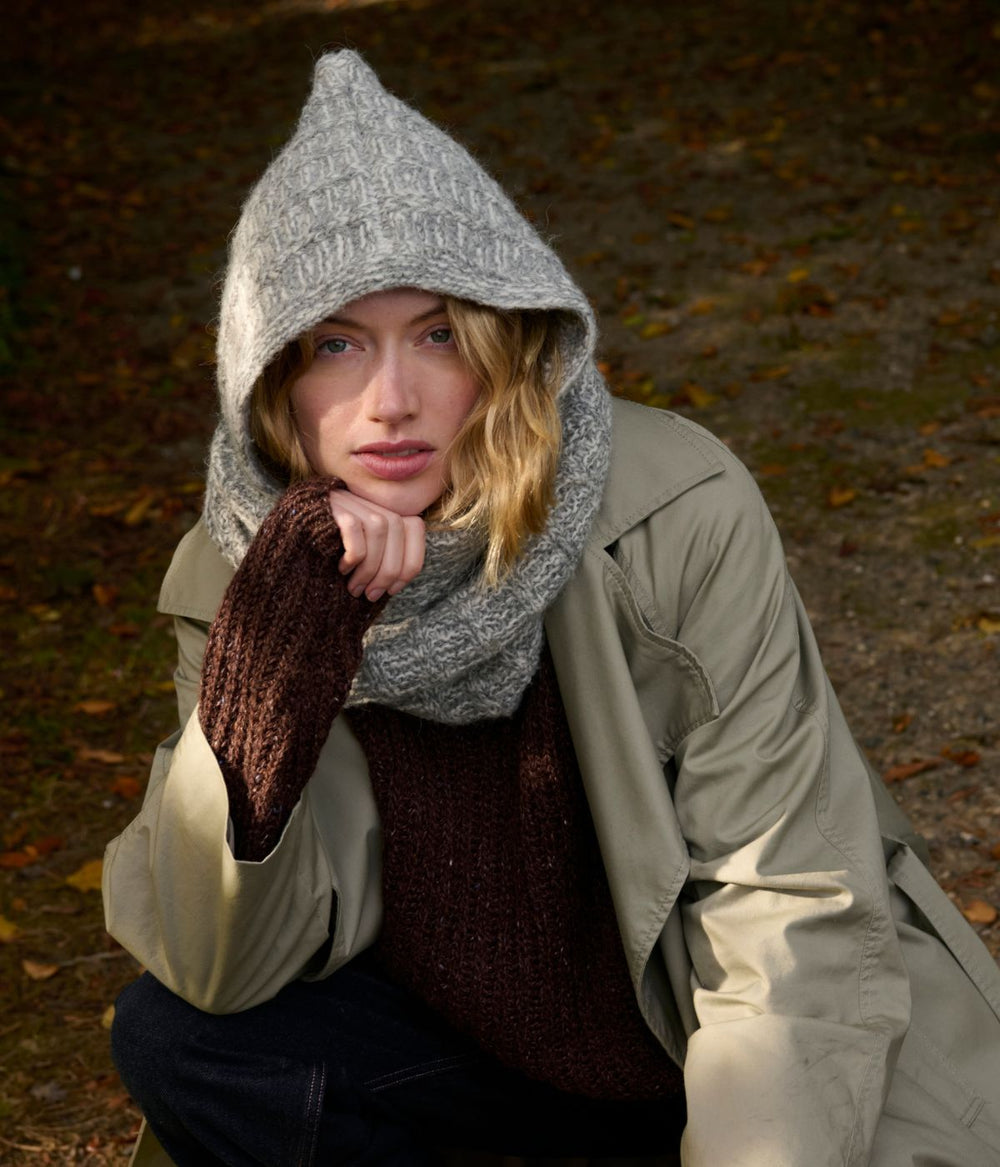 Kapuzenschal, gestrickt mit 2 Fäden: 1 Strang Mayflower Santiago Light und 1 Strang Mayflower Easy Care. Mit der Kombination von 2 Strängen können Sie ein schönes Farbspiel in Ihr Strickstück bringen, wenn Sie Garnqualitäten in verschiedenen Farbtönen wählen.