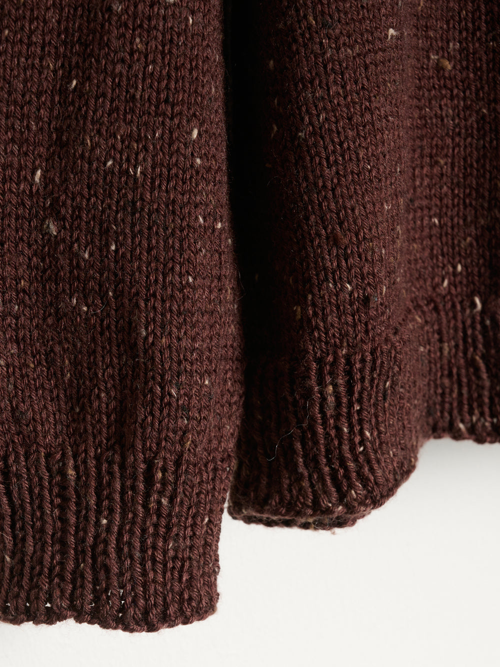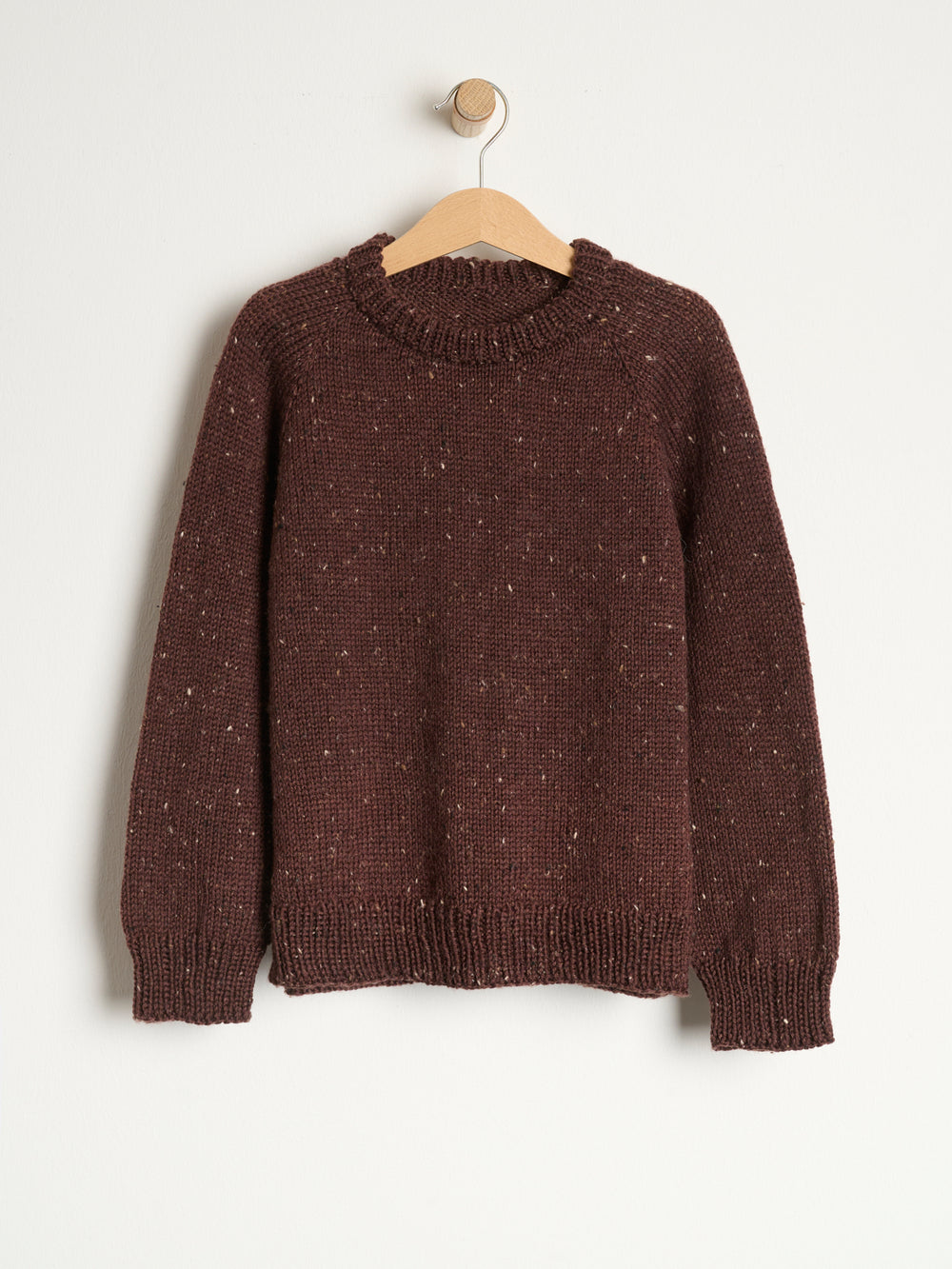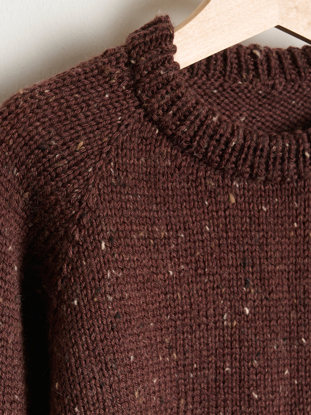Der Hanstholm Sweater Junior wird top-down gestrickt, mit Raglanzunahmen und verkürzten Reihen im Nacken für eine bessere Passform. Der Halsausschnitt wird doppelt gestrickt und umgeschlagen.