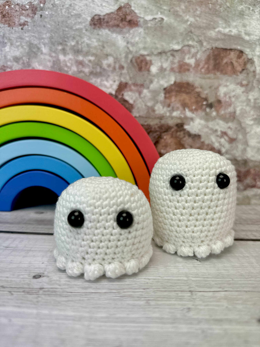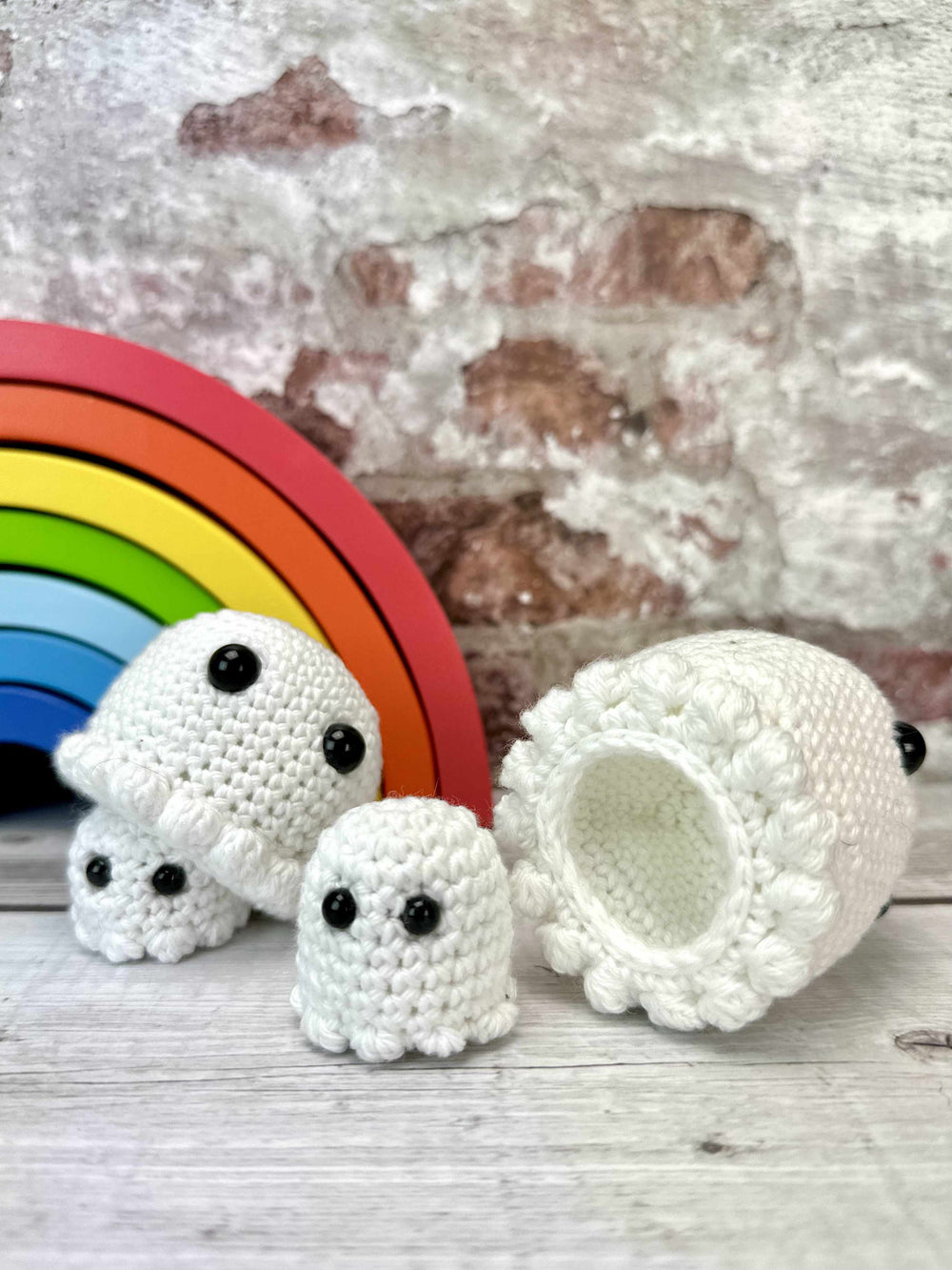Du erhältst zwei große Gespenster – eines hoch und eines niedrig, sowie ein hoch und ein niedriges Minigespenst, das innen passt. Die Anleitung enthält auch die Möglichkeit, die großen Gespenster ohne Öffnung für die kleinen zu machen.