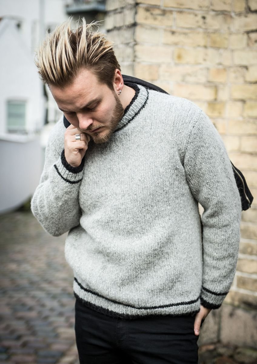 Ein schöner Herrenpullover, gestrickt aus hellgrauem Garn mit kontrastierenden schwarzen Rändern. Dadurch entsteht ein einfaches und zeitloses Design, das den meisten Männern, die einen warmen und stilvollen Pullover wollen, gefallen wird.