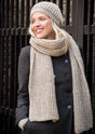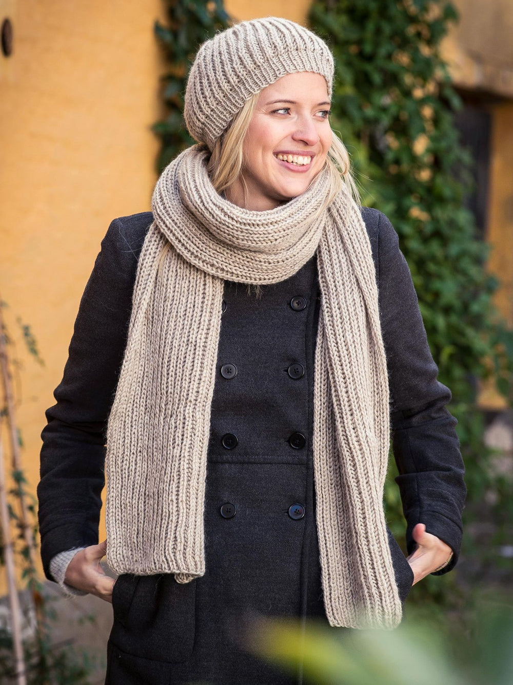Schönes Set mit Mütze und Schal, die beide im Patentmuster gestrickt sind. Es handelt sich um einfache Anleitungen, die leicht umzusetzen sind.