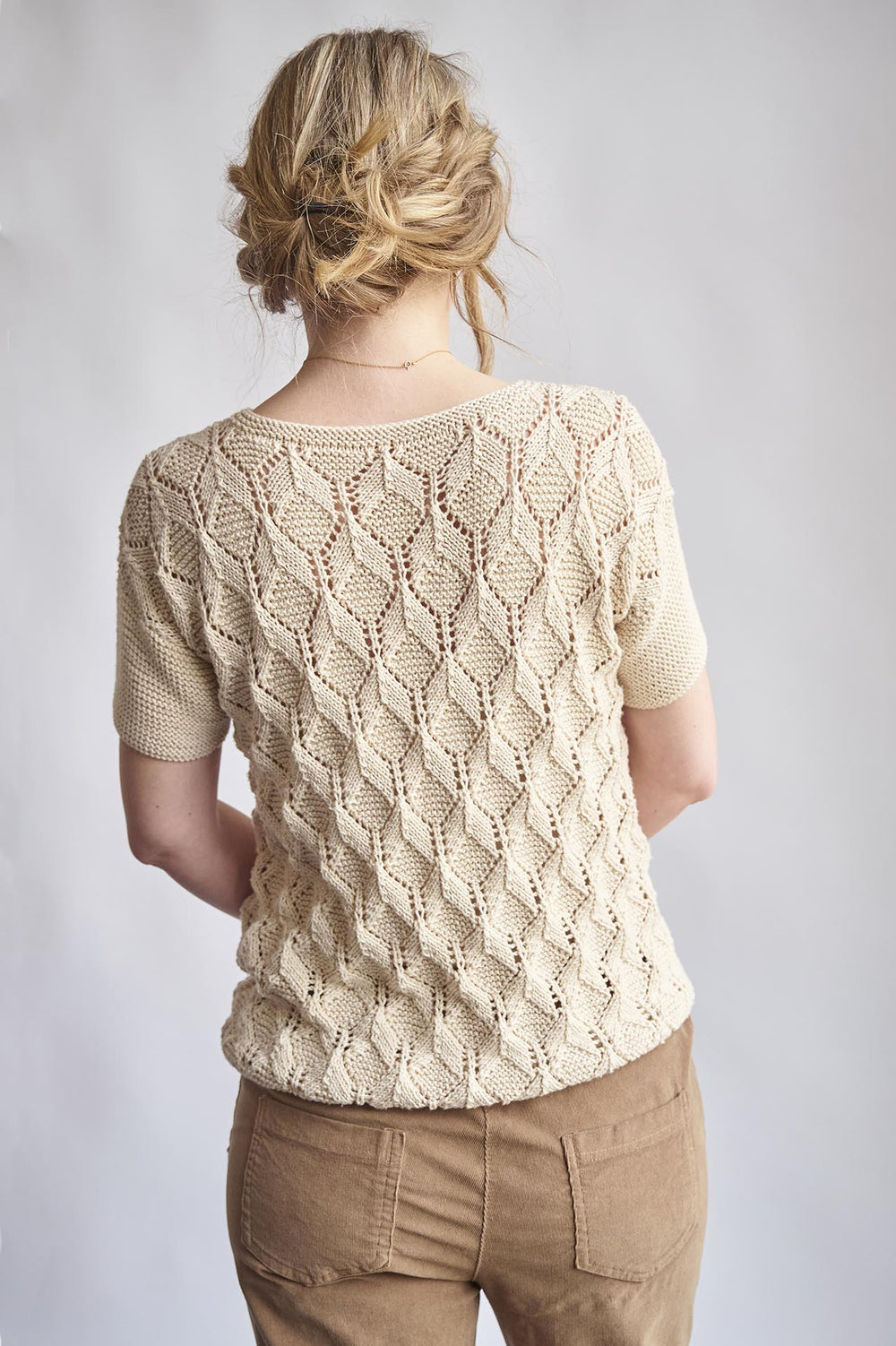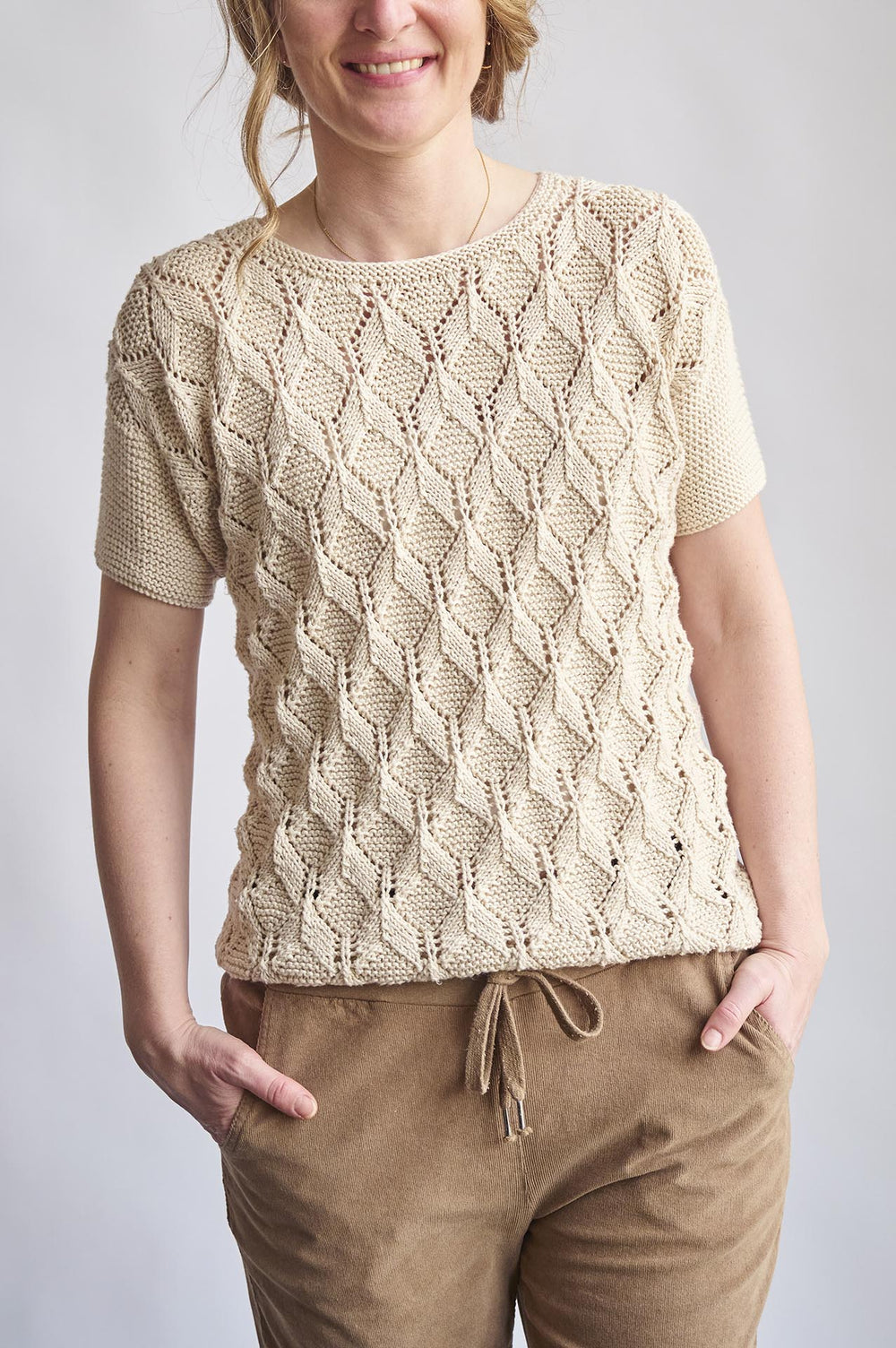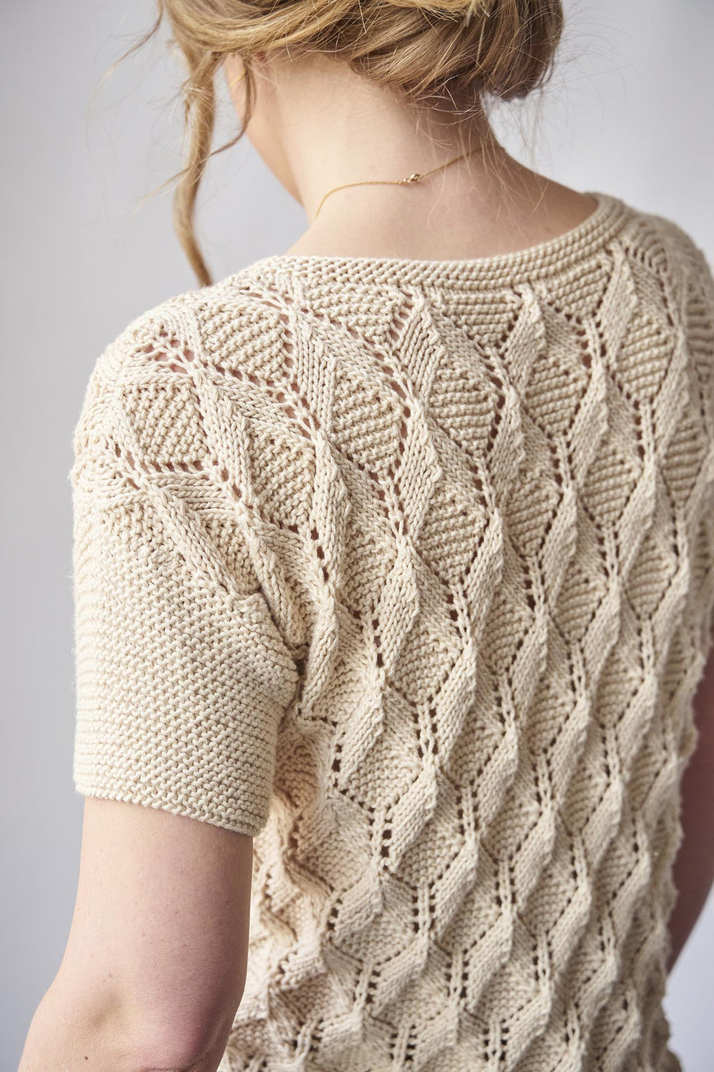Jette Tee ist eine köstliche, kurzärmelige Bluse, die ein schönes strukturelles Muster auf dem gesamten Vorder- und Rückstück hat, in dem verschiedene Techniken verwendet wurden. Die kurzen Ärmel und die Kanten werden in Retreats gestrickt. Stricken Sie die Bluse von unten und bis zum Armloch und dividieren Sie dann und jeder Teil, dann separat fertig.