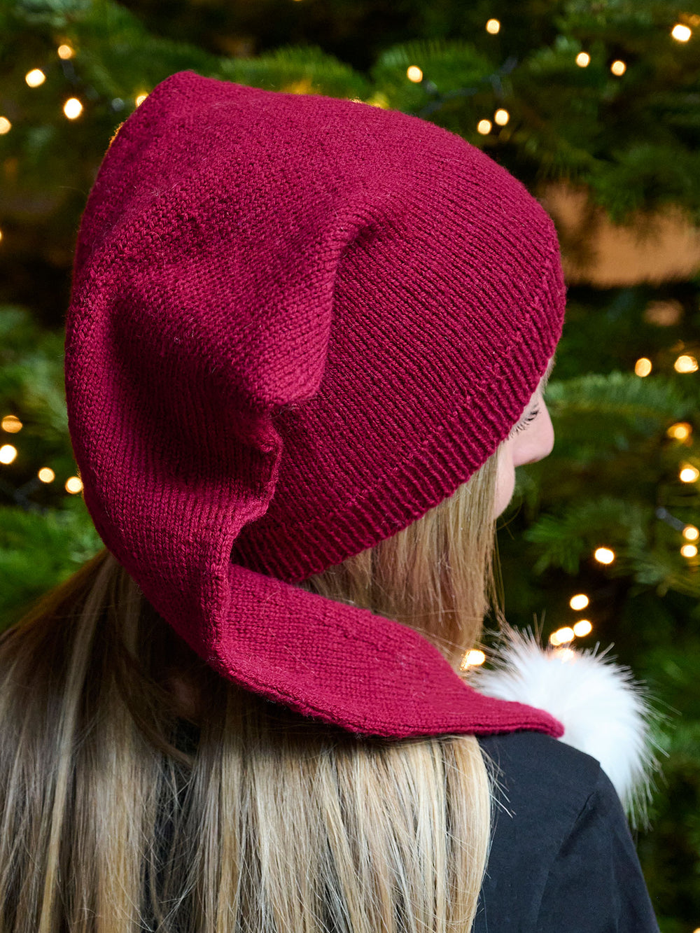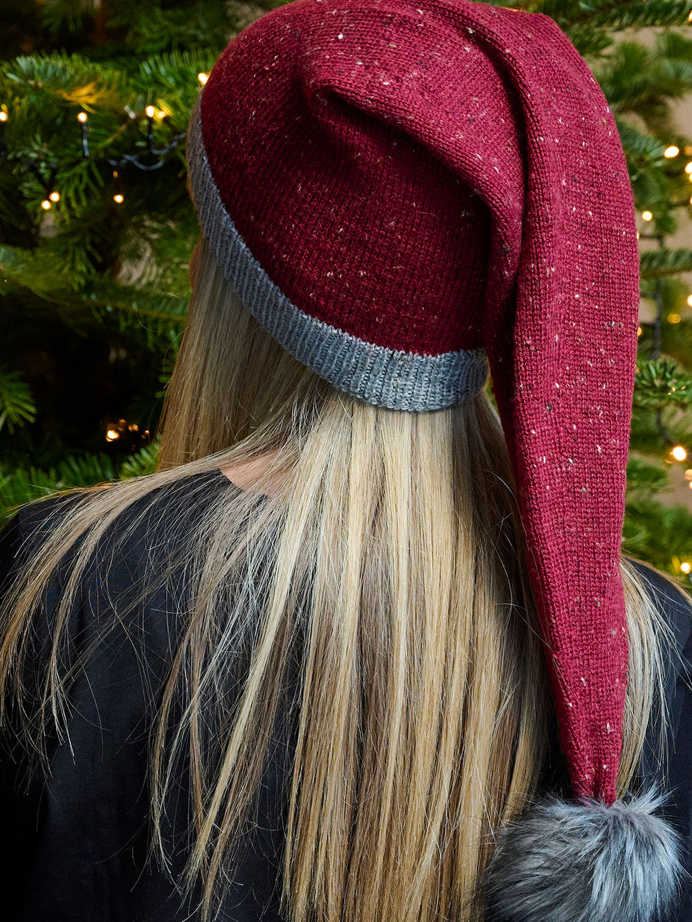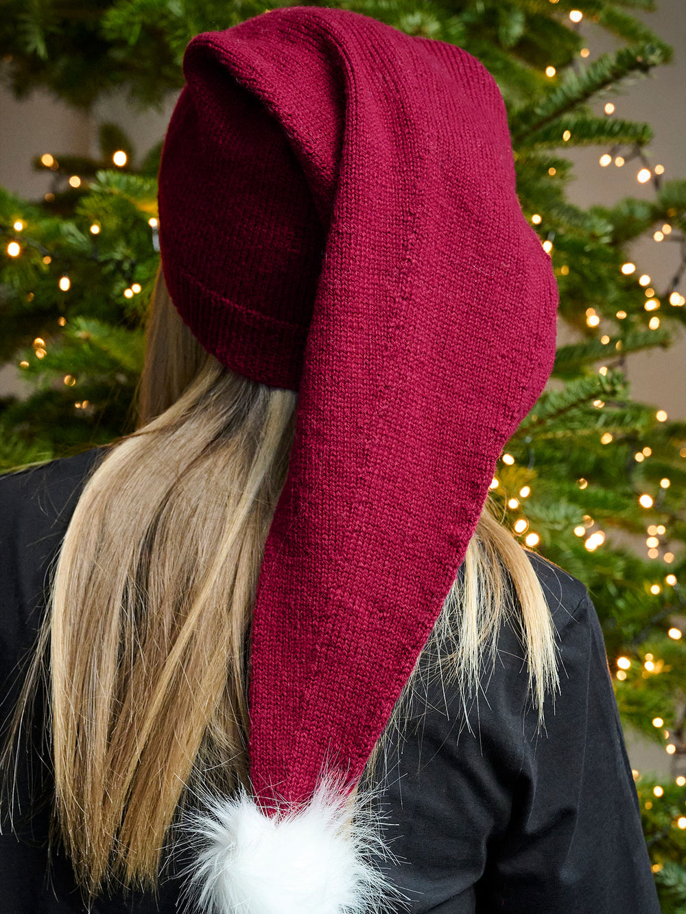 Eine schöne und warme Weihnachtsmütze für sowohl Kinder als auch Erwachsene, die dazu beitragen kann, Gemütlichkeit während der gesamten Weihnachtszeit zu schaffen. Diese Version hat zusätzliche Länge und endet mit einem weichen Bommel.