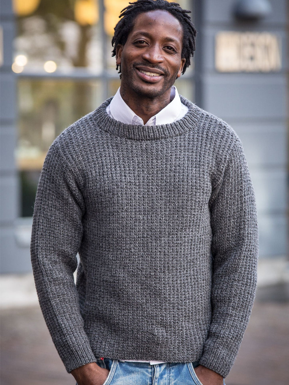 Klassisches, gut passender Männerpullover in Perlen, das von unten und oben strickt.