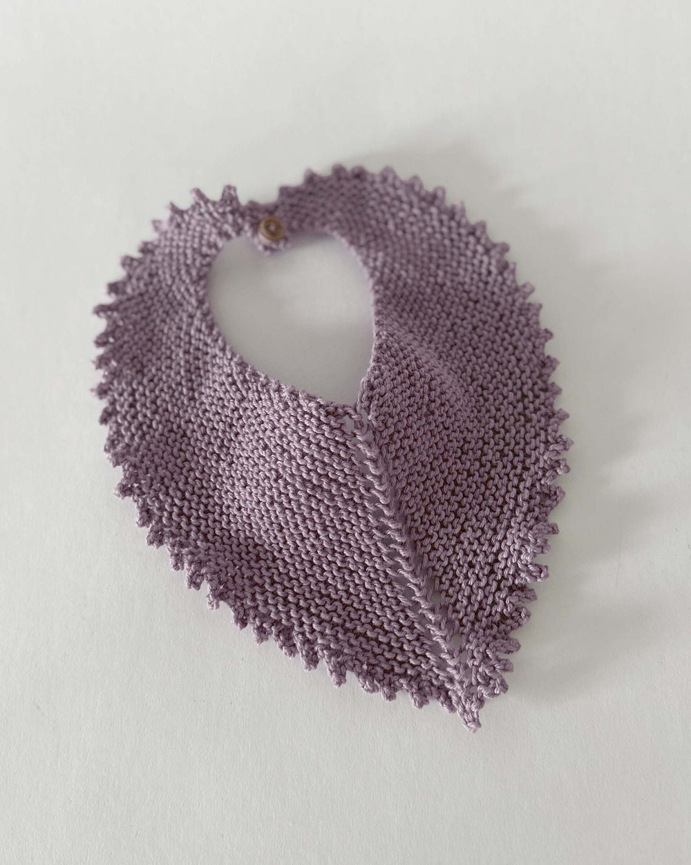 Einfache, gestrickte Lätzchen, die mit einem schönen Picot-Rand abgeschlossen werden. Das Lätzchen wird in Mayflower Cotton 8/4 gestrickt, das ein praktisches Garn ist, da es auch bei hohen Temperaturen gewaschen werden kann.