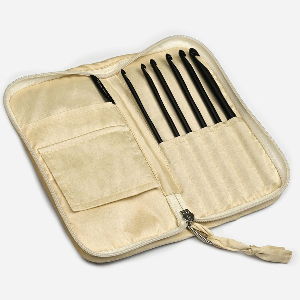 Die Häkelsauceet -Radiance wird in einer weichen Abdeckung mit einem Reißverschluss geliefert, der aus reiner Seide besteht. Am Ende gibt es ein gestickeltes Muster. Die Abdeckung füllt nicht viel und kann leicht in eine Tasche aufgenommen werden, wenn Sie in mehreren Größen Häkelstifte haben, wenn Sie unterwegs sind.