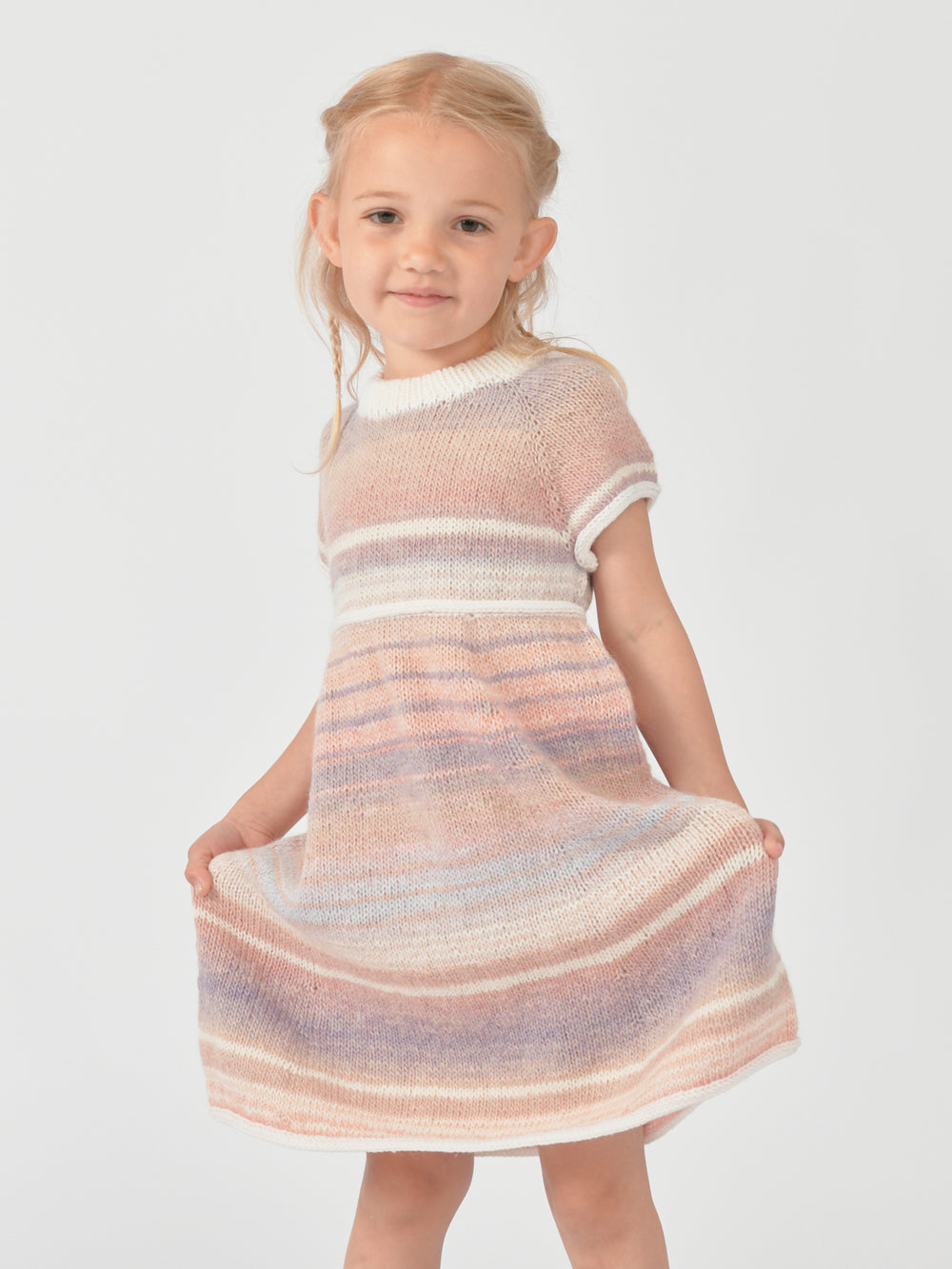 Taormina ist eine weiche Alpakamischung und daher eine gute Wahl für Bekleidung, und wirklich süß im weichen Lavendel Kleid. Das Muster deckt die Größen 2 - 8 Jahre ab.