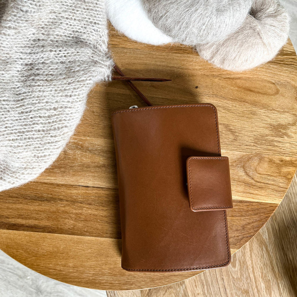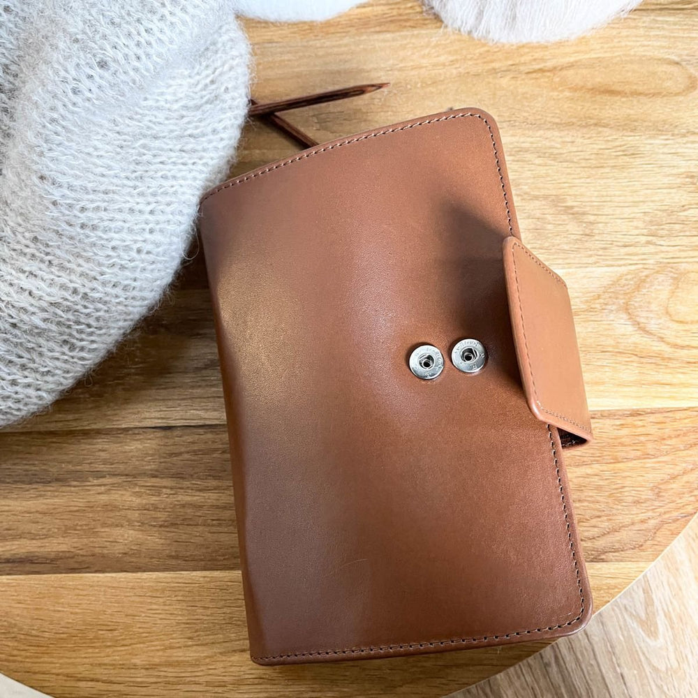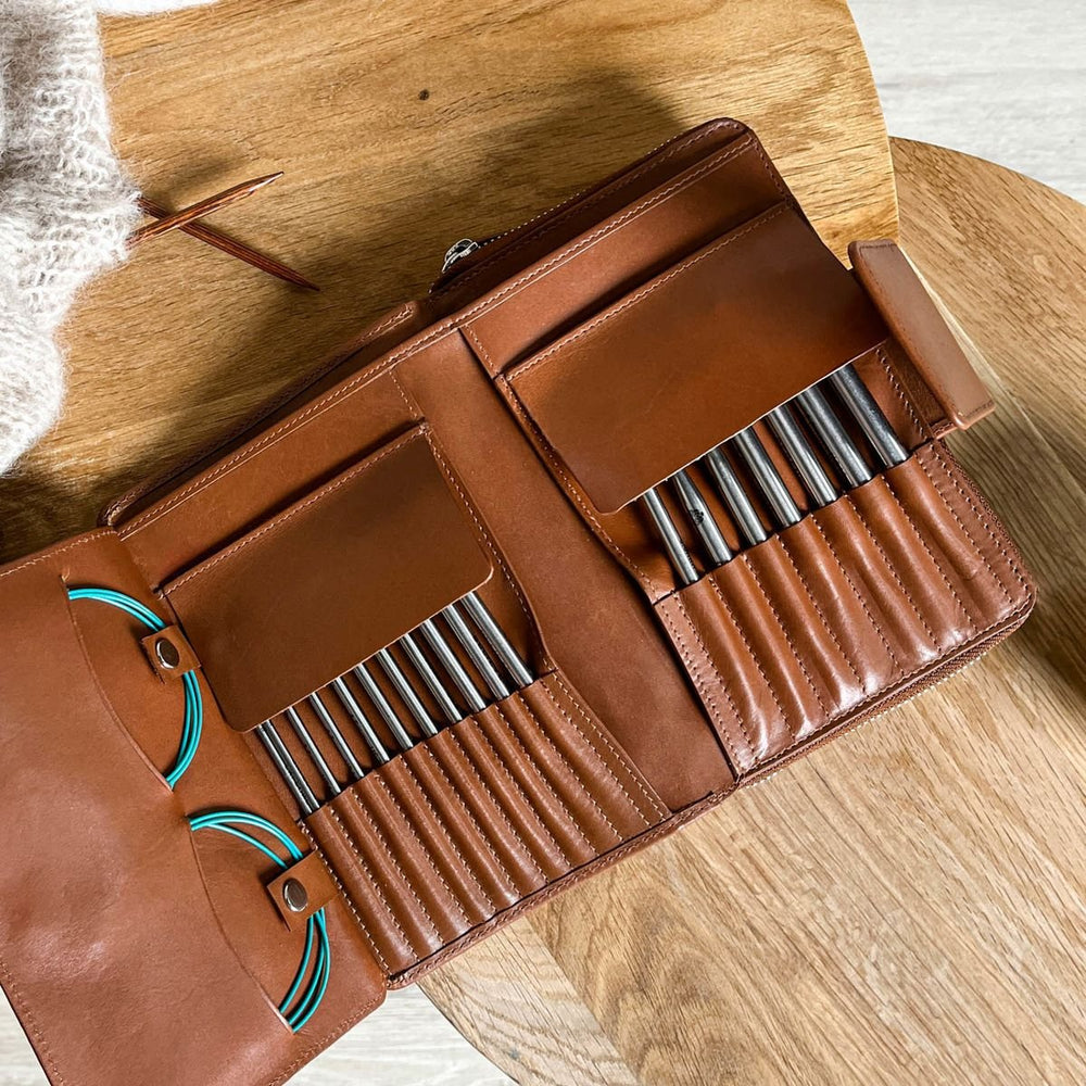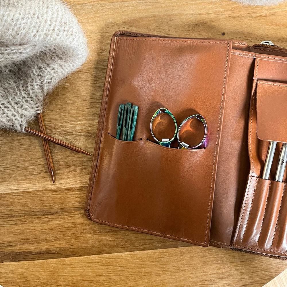 Das Leder in einem brandneuen Etui ist bewusst sehr straff. Im Gebrauch wird sich das Leder dehnen und sich nach deinen Stricknadeln formen. Das Etui misst 19 x 13 cm und ist auch in der Farbe Schwarz erhältlich.