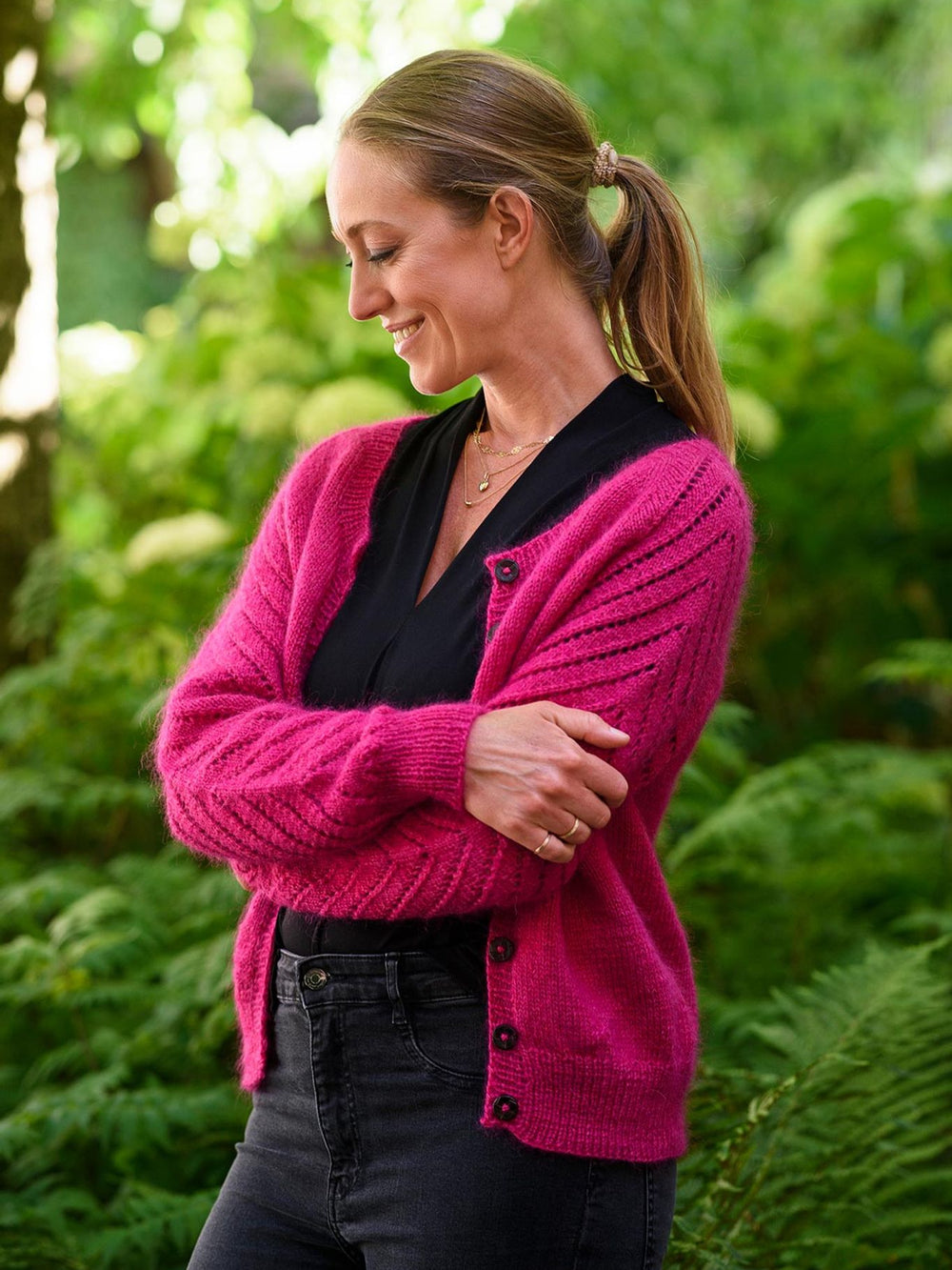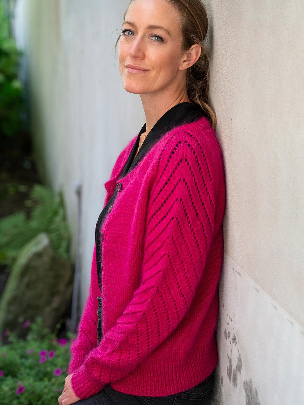 Die Liva-Strickjacke ist einfach und ausdrucksstark zugleich, denn die Strickjacke im Stockinettestrick hat ein zartes Spitzenmuster an den Raglanärmeln, das für einen gewissen Pfiff sorgt. Die Strickjacke wird von oben nach unten mit Stockinette-Maschen auf der Vorder- und Rückseite gestrickt. Das Muster führt Sie durch das Spitzenmuster.