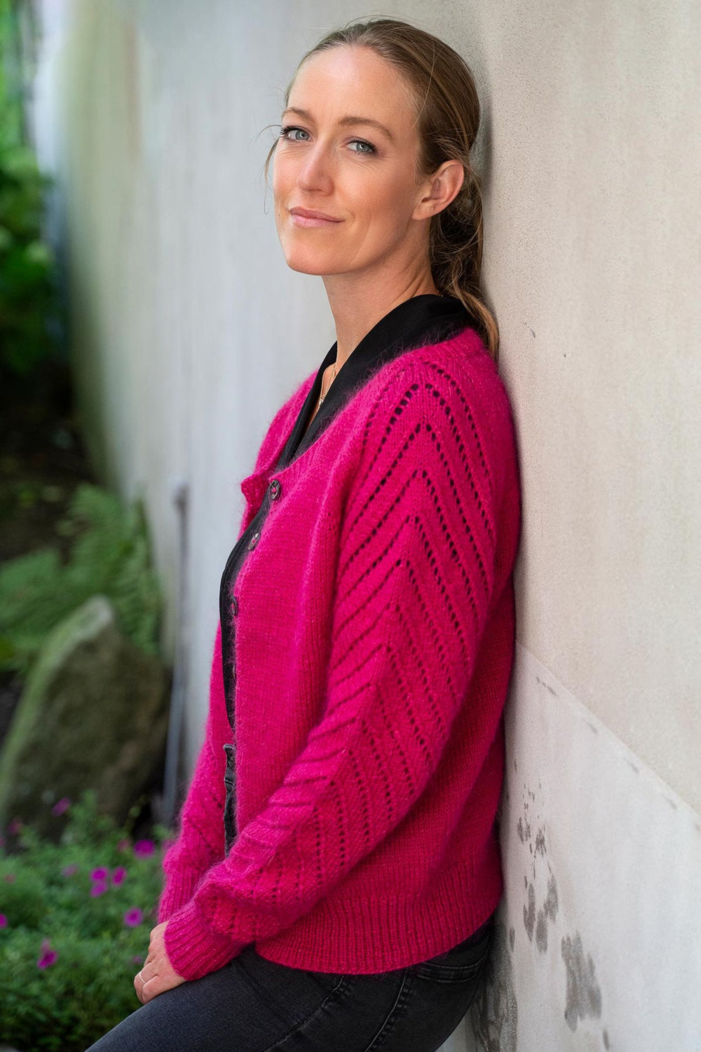 Die Liva-Strickjacke ist einfach und ausdrucksstark zugleich, denn die Strickjacke im Stockinettestrick hat ein zartes Spitzenmuster an den Raglanärmeln, das für einen gewissen Pfiff sorgt. Die Strickjacke wird von oben nach unten mit Stockinette-Maschen auf der Vorder- und Rückseite gestrickt. Das Muster führt Sie durch das Spitzenmuster.