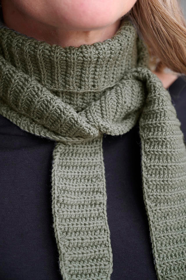 Der Schal wird in einem Rippenmuster gehäkelt, indem halbe doppelte Maschen in die hintere Schlaufe gehäkelt werden. Das Muster enthält zwei verschiedene Schalgrößen, und Sie können wählen, wie lang Ihr Schal werden soll.