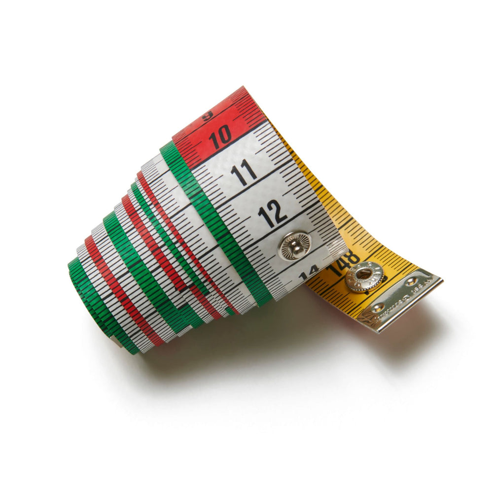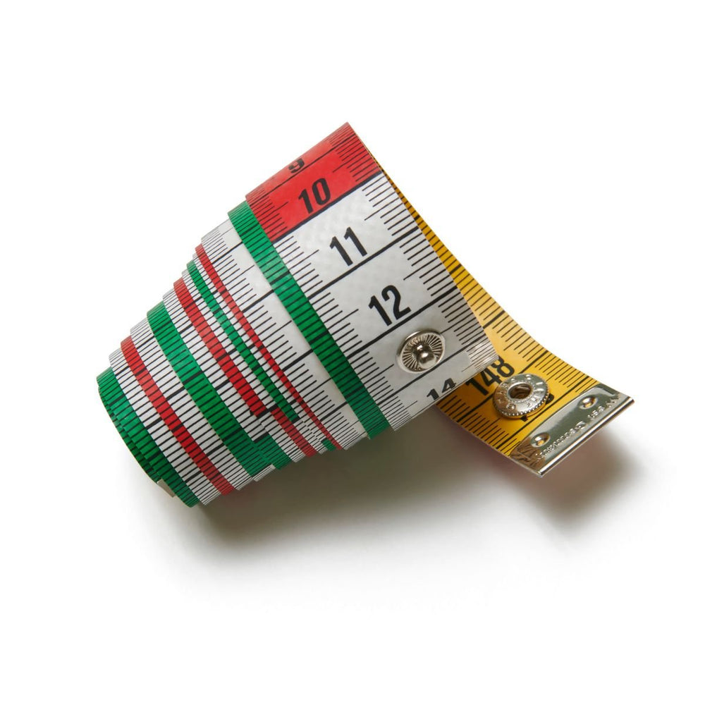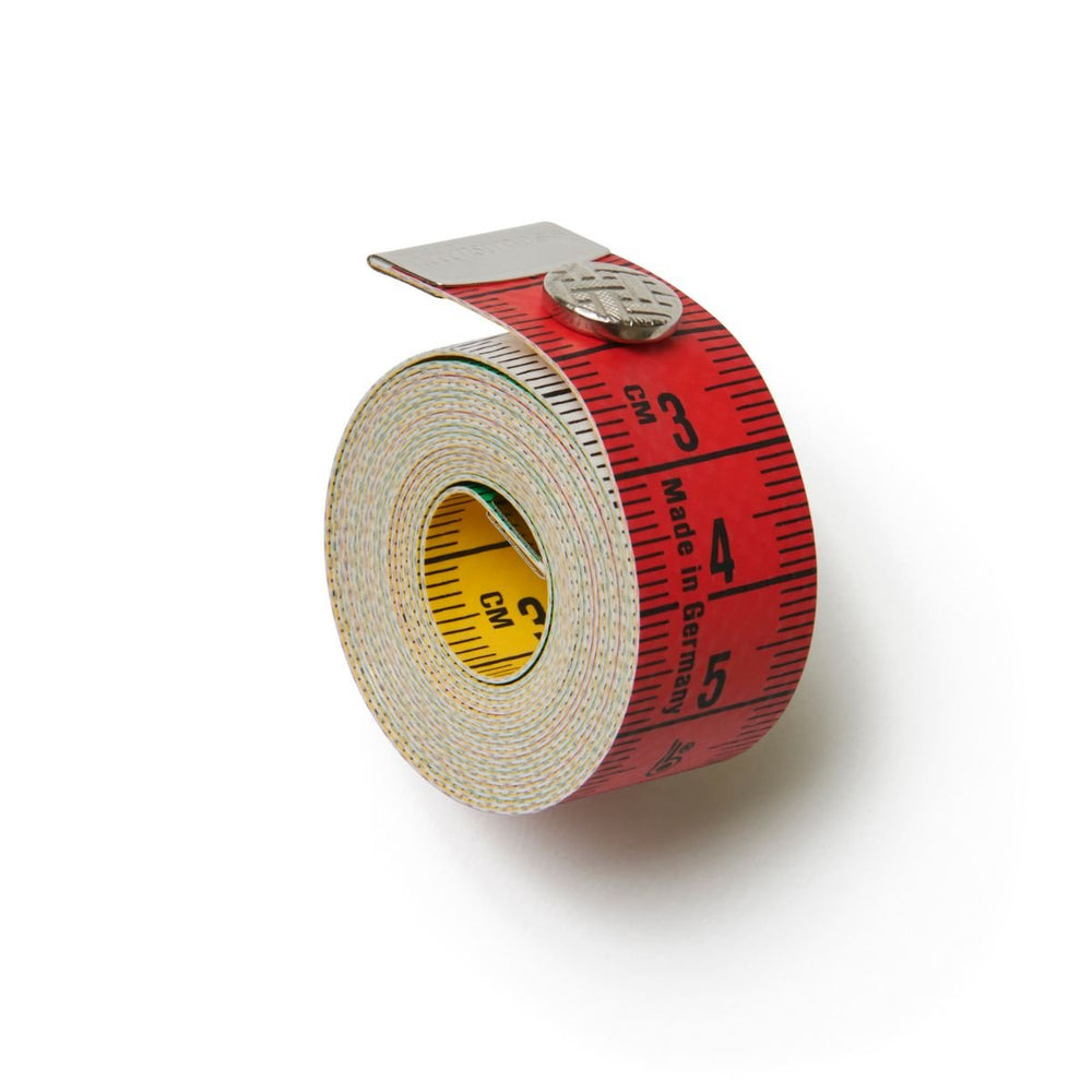 Praktisches Maßband mit einer Länge von 150 cm, hergestellt aus einem robusten Material. Das zusammengerollte Maßband lässt sich mit einem Druckknopf verschließen, um es sicher zusammenzuhalten.