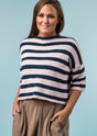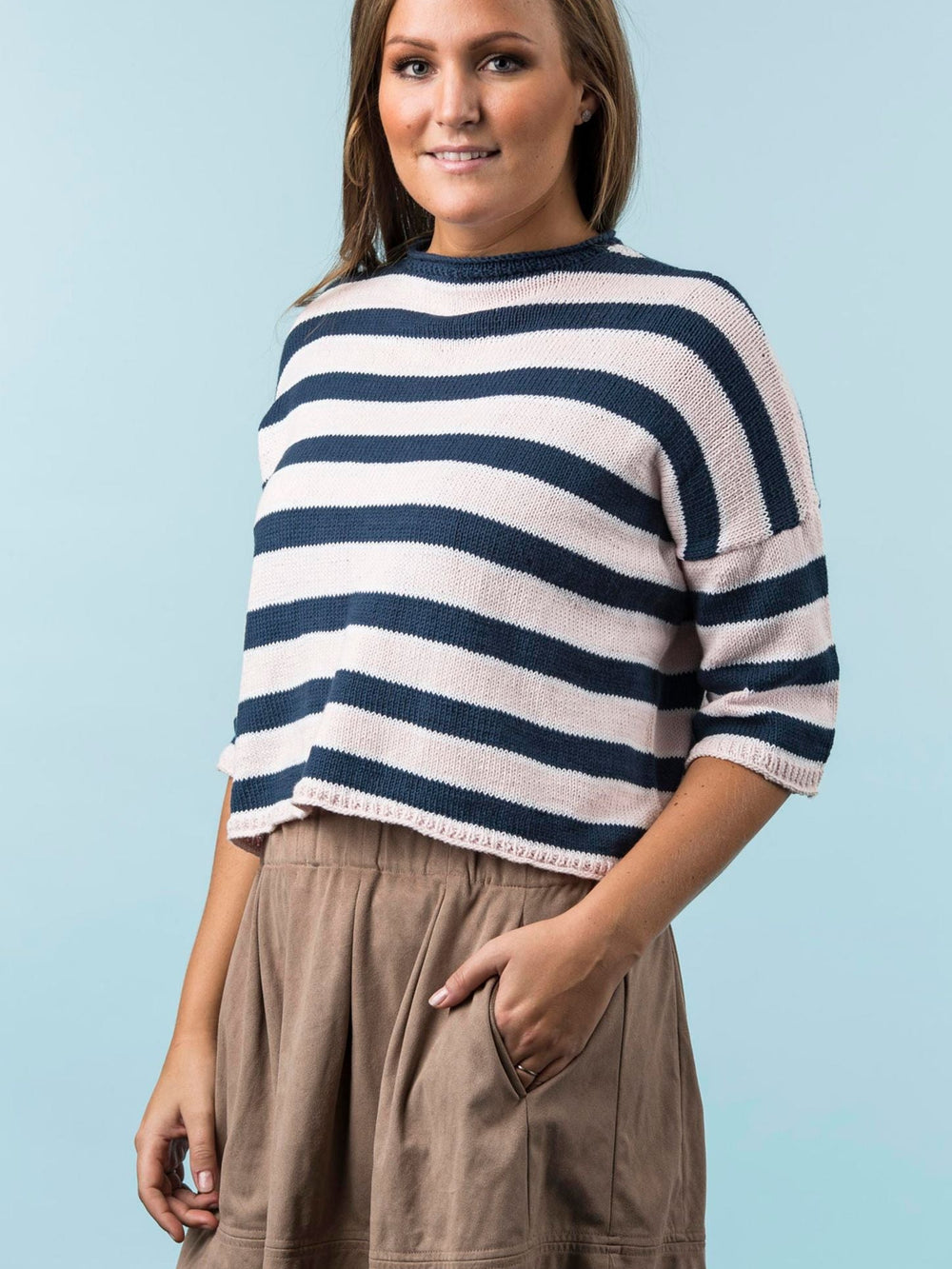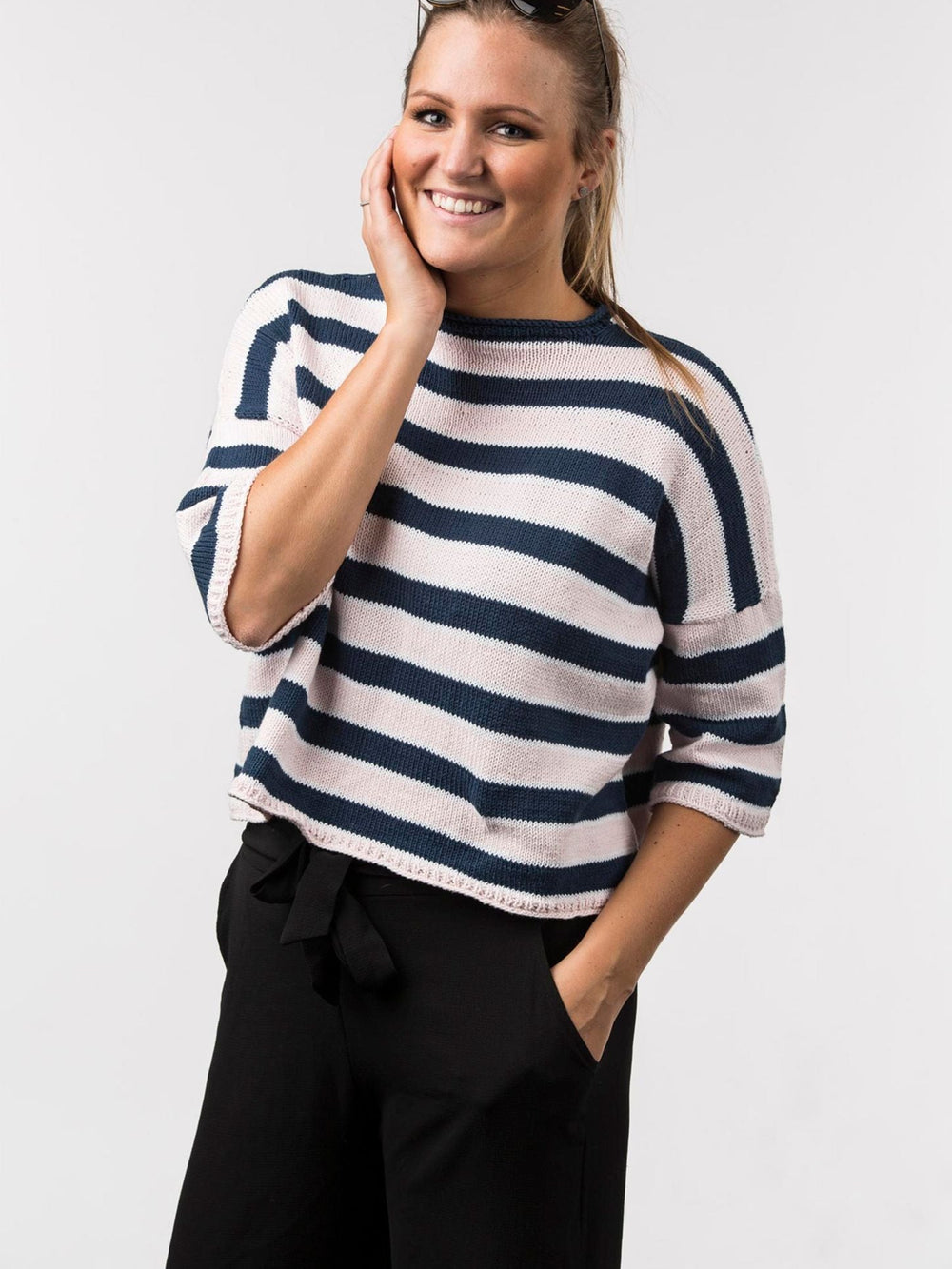 Die Bluse wird von unten nach oben gestrickt. Die Arbeit wird an den Armöffnungen geteilt, und Vorder- und Rückenteil werden jeweils separat fertiggestellt. Unterwegs wird die Farbe gewechselt und Streifen gestrickt. Die Ärmel werden separat gestrickt und angenäht. Die Anleitung ist relativ einfach für Anfänger, da sowohl die Passform als auch die Streifen sehr einfache Details sind.
