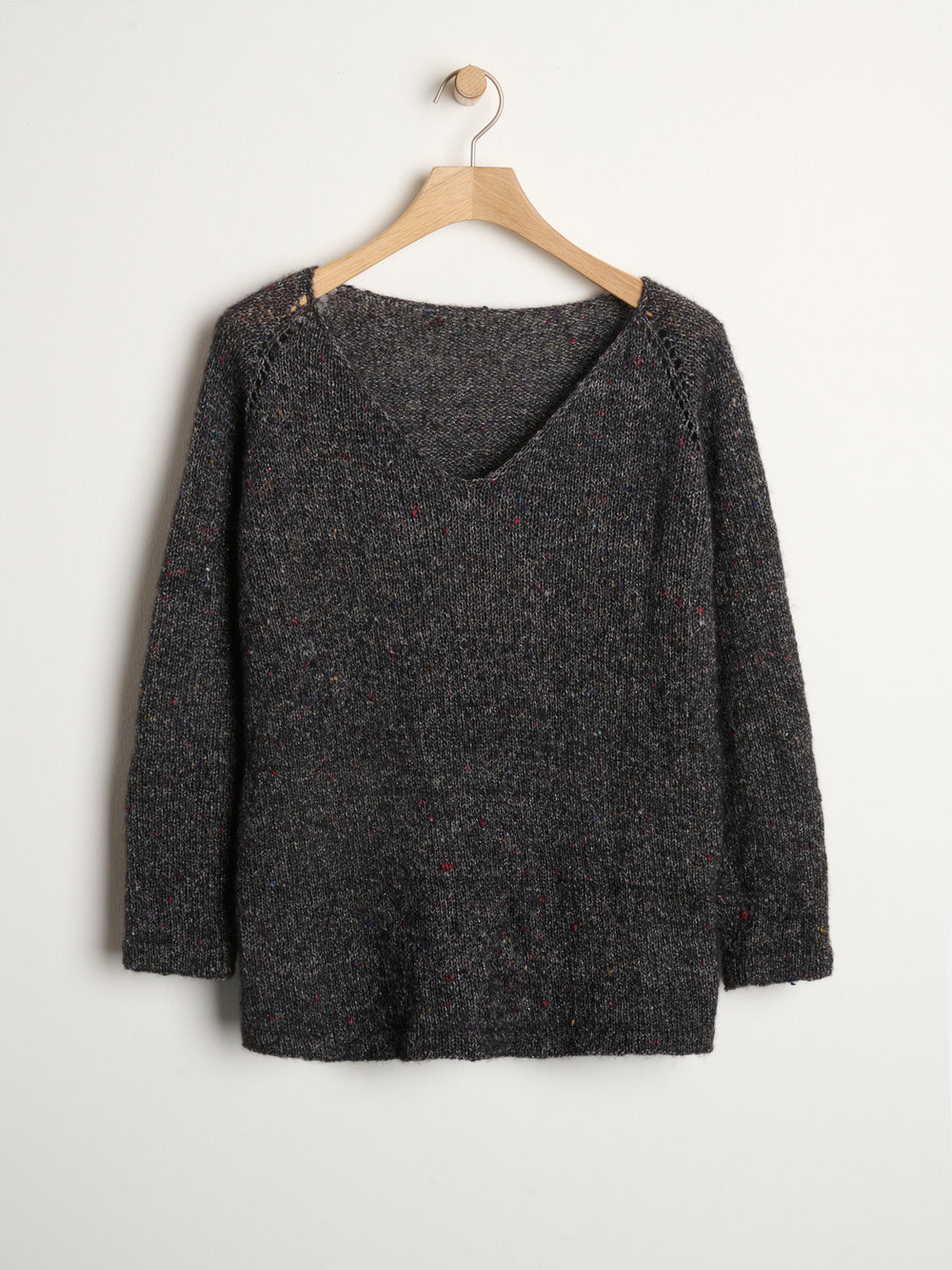 Der Pullover hat eine regelmäßige lockere Passform mit einem 4 -cm -Bewegungsraum. Es macht es leicht locker -passend und sehr bequem, aber es ist nicht direkt übergroß. Gleichzeitig enthält der Pullover auch eine Reihe feiner Details wie die Schulterauslässe, die durch ein wunderschönes Hohlmuster sowie den breiten V-Ausschnitt hervorgehoben werden.