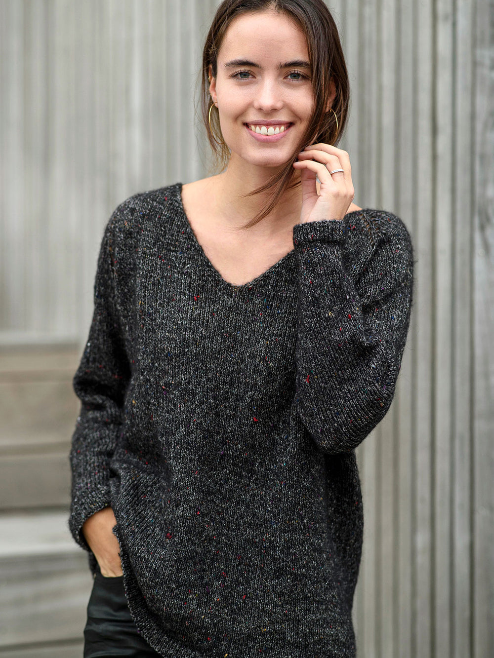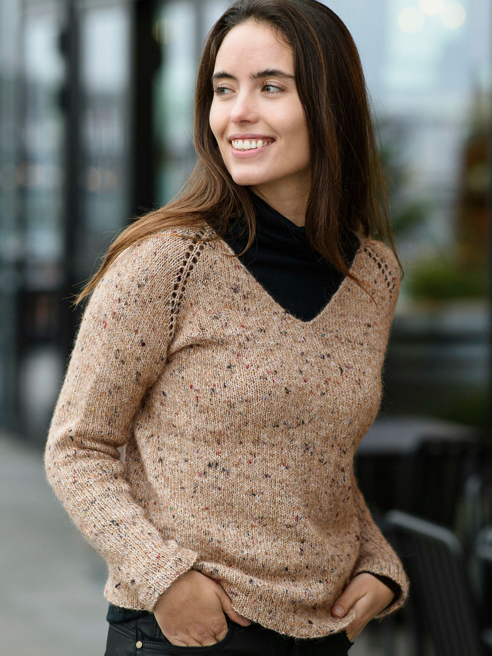 Nina -Pullover ist in Casablanca Lux gestrickt, einer schönen Garnmischung mit Alpaka, Wolle und Baumwolle. Das Garn wird auch durch einen diskreten Glimmerdraht ergänzt, der zusammen mit dem gebürsteten, abholten Look, den Casablanca Lux hat, einen verrückten netten Effekt verleiht.