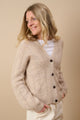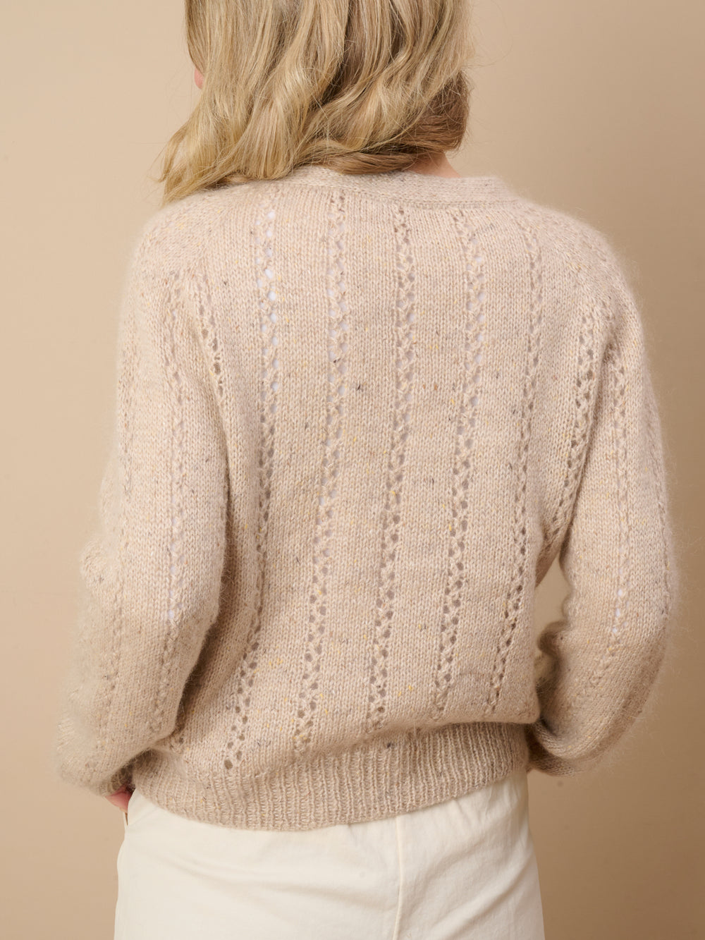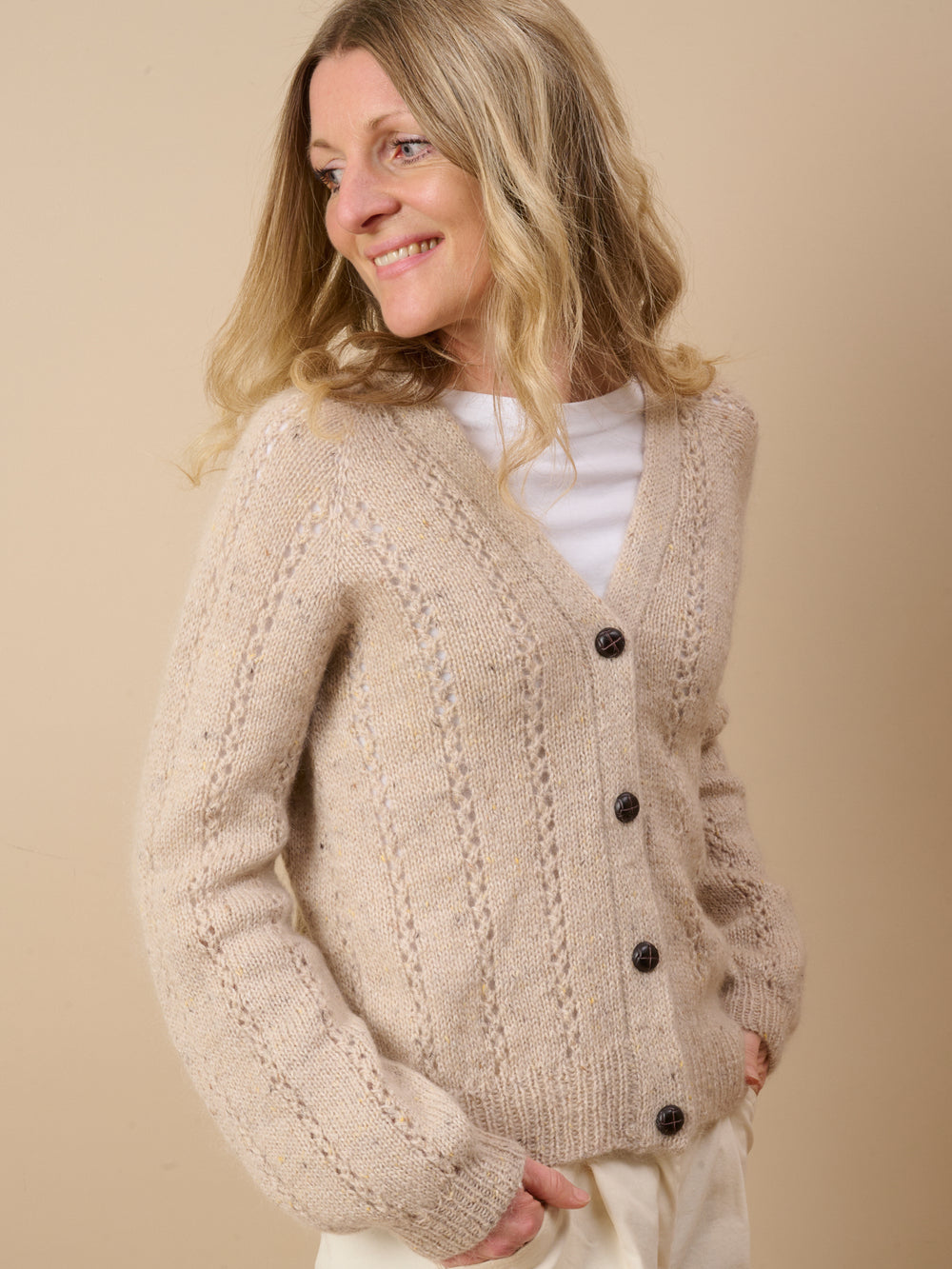 Der Odder Cardigan ist mit je einem Faden Mayflower Birmingham und Mayflower Super Kid Silk gestrickt. Unser Birmingham-Garn zeichnet sich durch ein schönes Tweed-Look aus, das in Kombination mit Super Kid Silk dezenter und zurückhaltender wirkt.