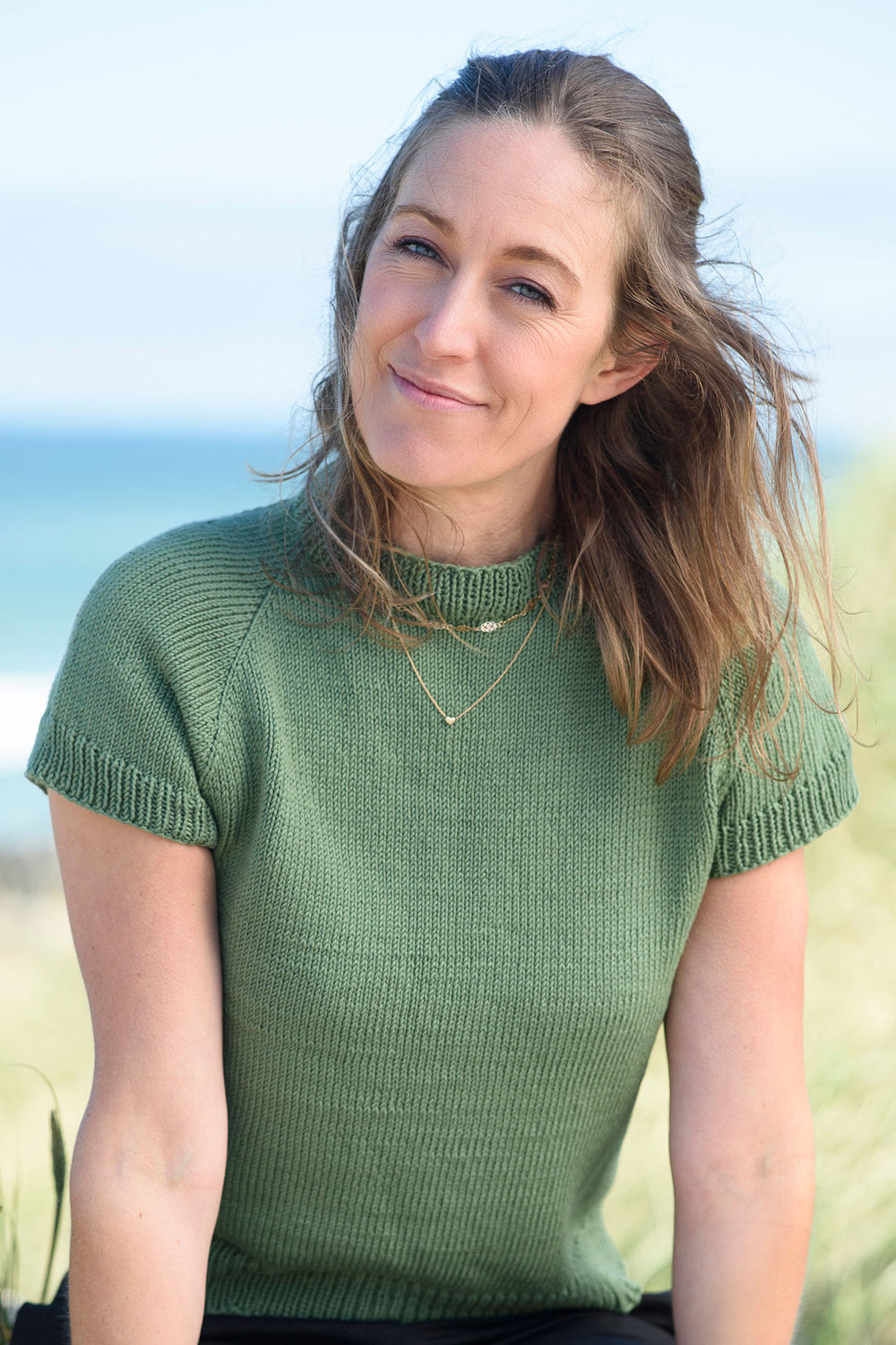 Mayflower Amalfi ist in vielen wunderschönen Farben mit toller Farbtiefe und leichtem Glanz erhältlich. Du kannst die Penelope Tee einfarbig stricken, wie in diesem Modell gezeigt – oder mehrere Farben kombinieren und ihr einen gestreiften Look verleihen. Beides passt wunderbar zu diesem zeitlosen, stilvollen Design.