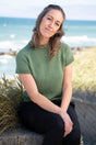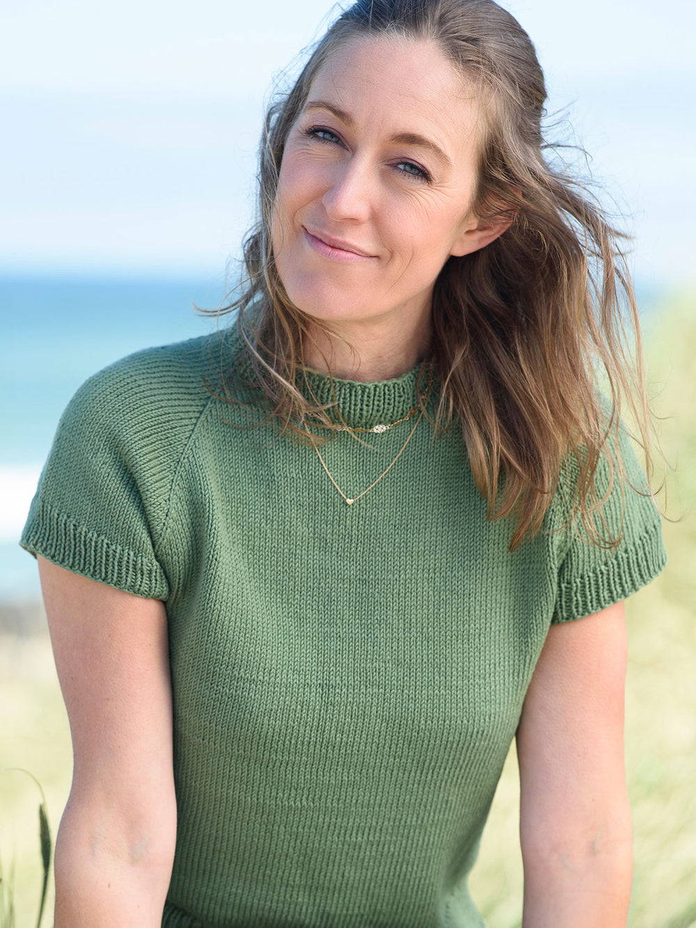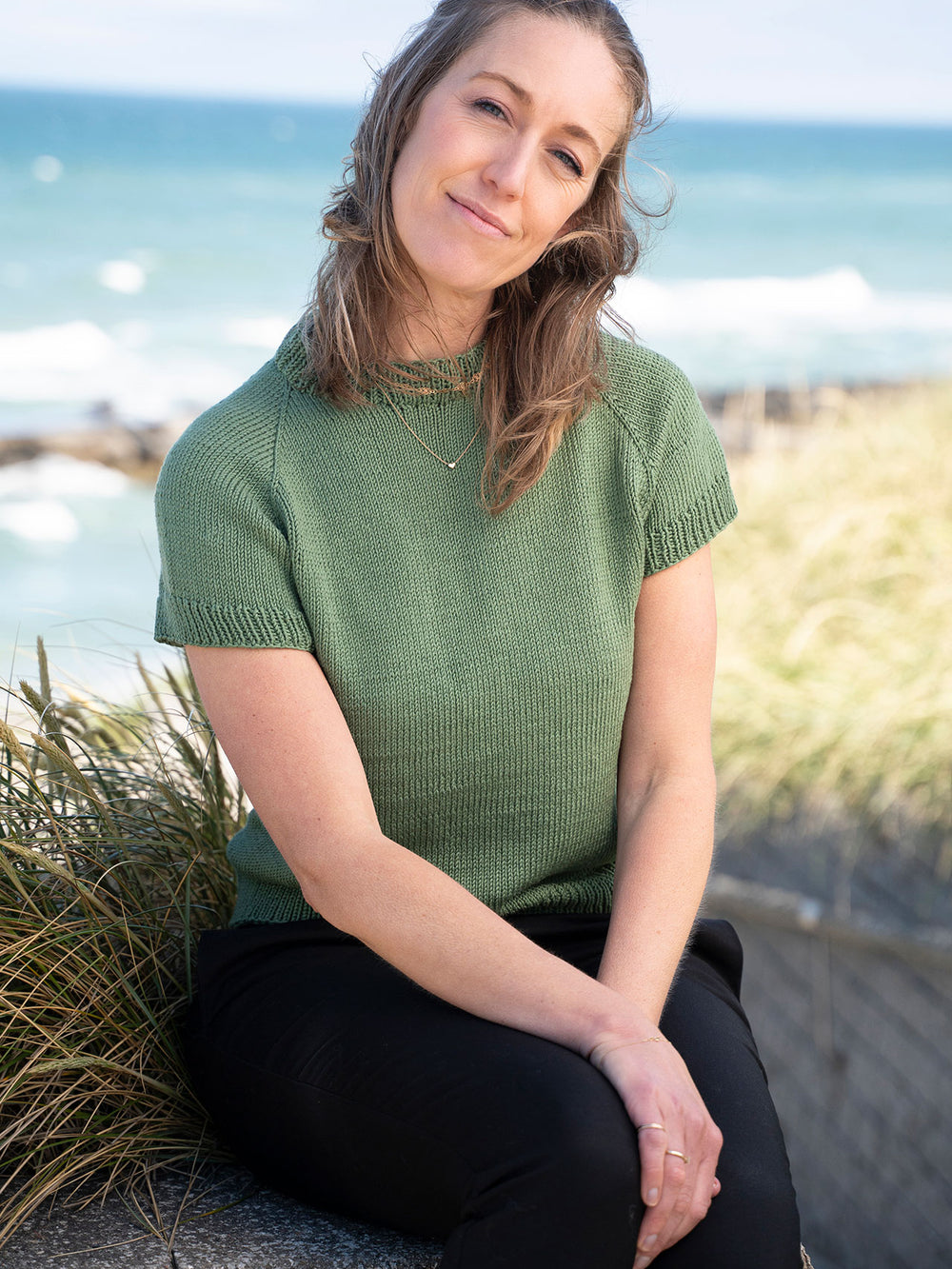 Mayflower Amalfi ist in vielen wunderschönen Farben mit toller Farbtiefe und leichtem Glanz erhältlich. Du kannst die Penelope Tee einfarbig stricken, wie in diesem Modell gezeigt – oder mehrere Farben kombinieren und ihr einen gestreiften Look verleihen. Beides passt wunderbar zu diesem zeitlosen, stilvollen Design.