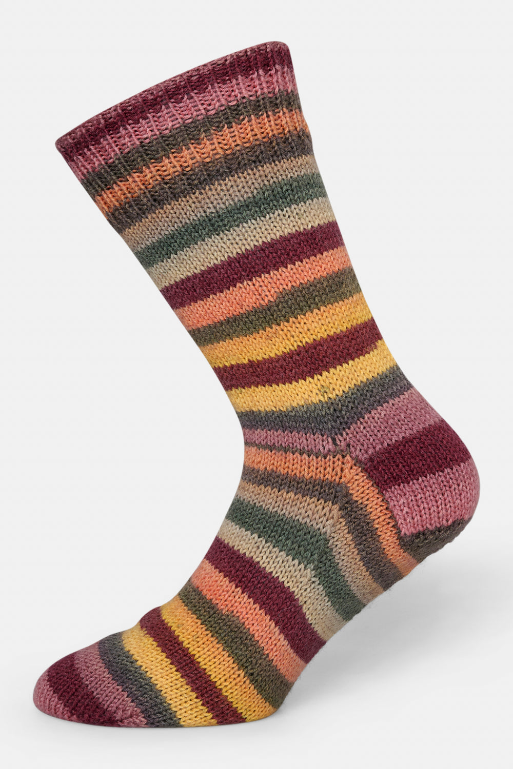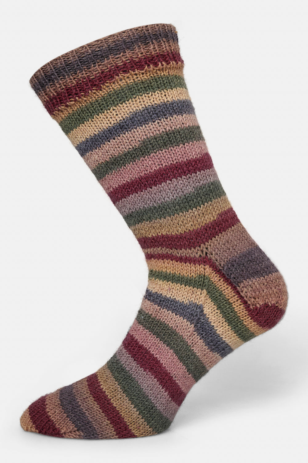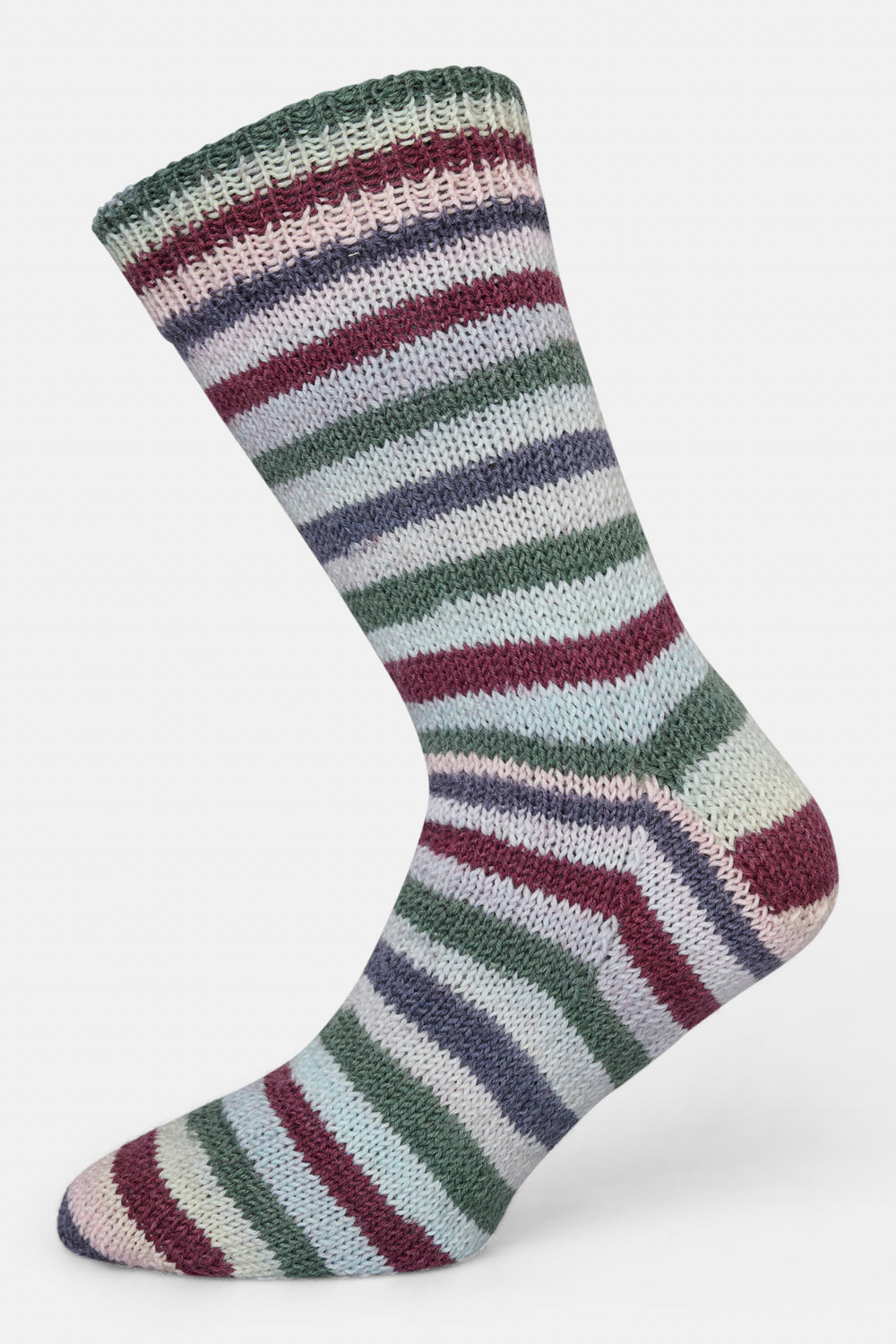 Die Socken sind aus dem schönen Sockengarn Mayflower Premium Sock Wool Ocean gestrickt, das zu 75 % aus warmer Wolle und zu 25 % aus strapazierfähigem Polyamid gesponnen ist. Die kuschelige Wolle hält die Füße warm, während das Polyamid für eine hohe Strapazierfähigkeit sorgt und die Socken für jahrelangen Gebrauch geeignet macht. Mit anderen Worten: Premium Sock Wool ist ein sehr hochwertiges Sockengarn. Die Ocean-Serie verleiht den Socken ein gestreiftes Muster.