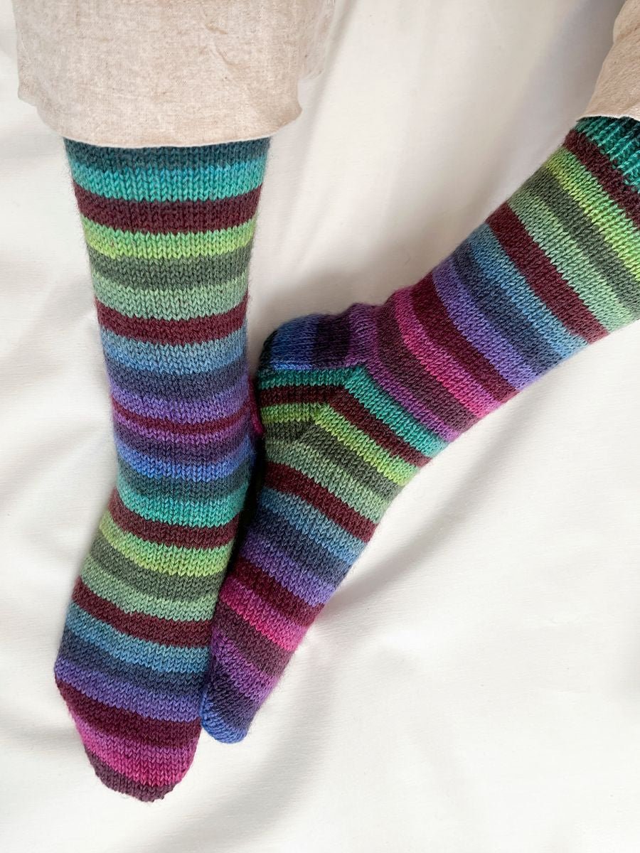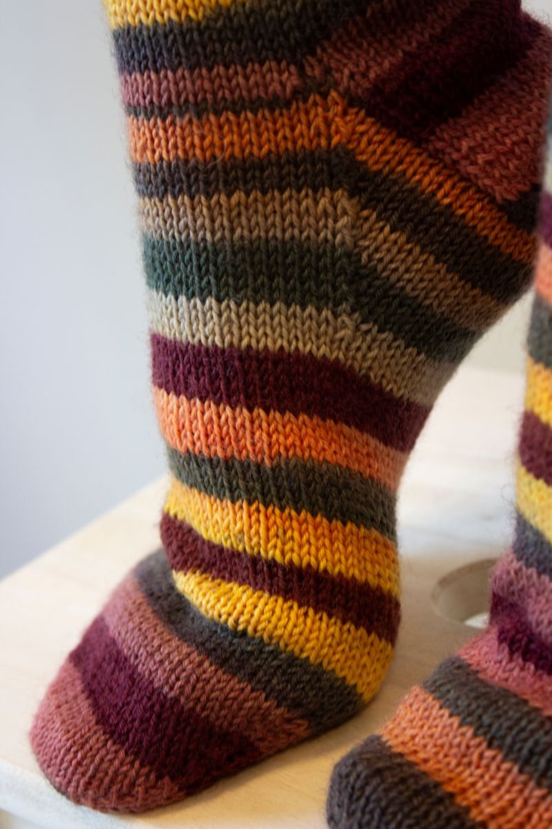 Klassische und einfache, aber schöne Socken mit Keilabsatz. Die Socken werden im Stockinette-Muster gestrickt, mit einem gerippten Rand am oberen Ende. Mit der Stockinette-Masche können Sie das Bein und die Sohle schnell stricken, und das Muster führt Sie sowohl durch die Ferse als auch durch die Zehen. Das Endergebnis ist ein schönes, gemütliches Paar Socken mit einem schönen Streifenmuster.