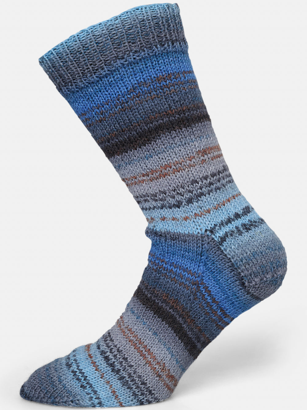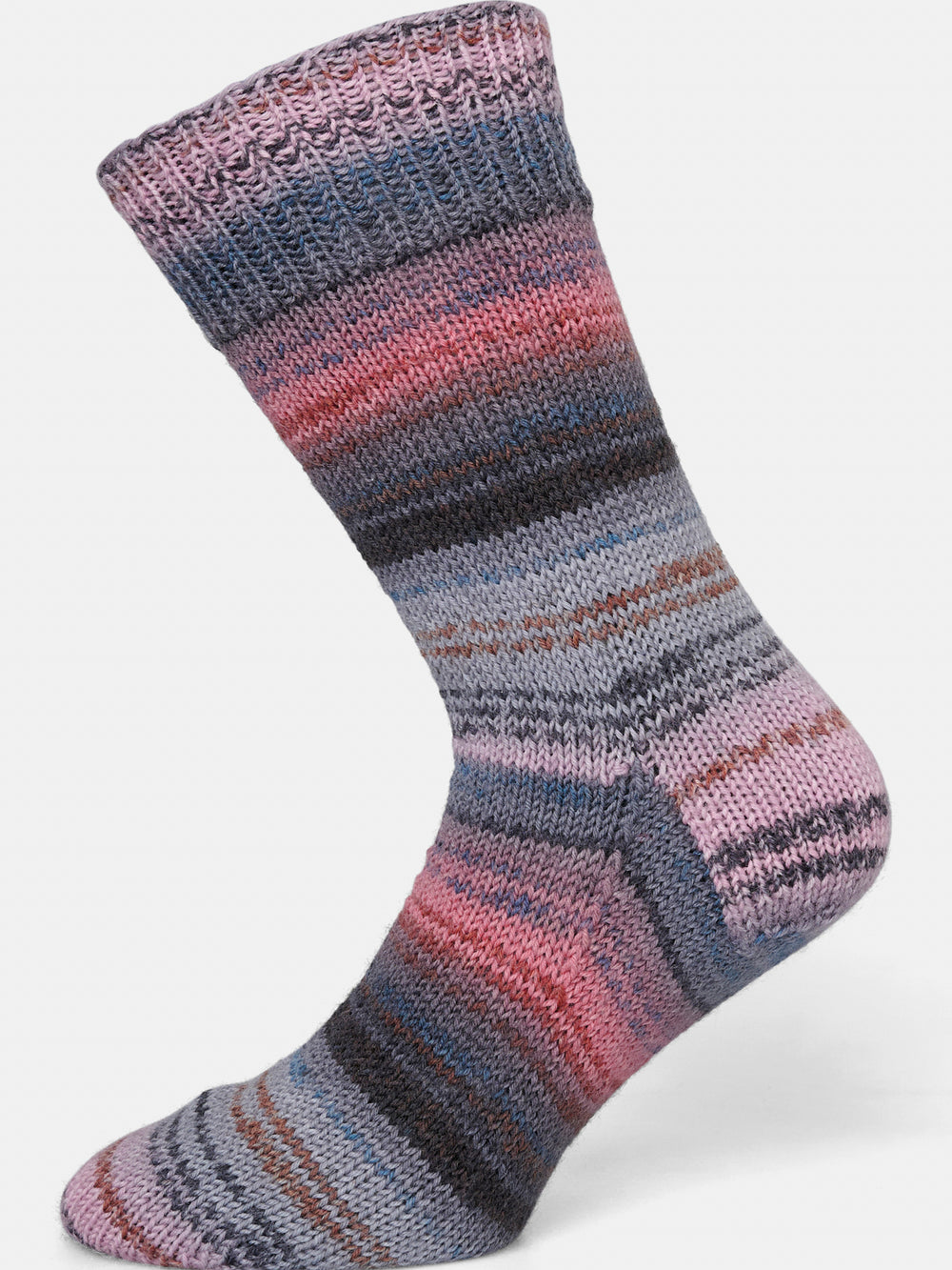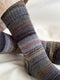 Eine einfache und schöne Socke mit Keilabsatz. Die Socke ist im Stockinette-Stich gestrickt und hat ein geripptes Oberteil. Die einfache Konstruktion bedeutet, dass der Fokus auf den Farben des Garns und dem schönen Muster liegt.