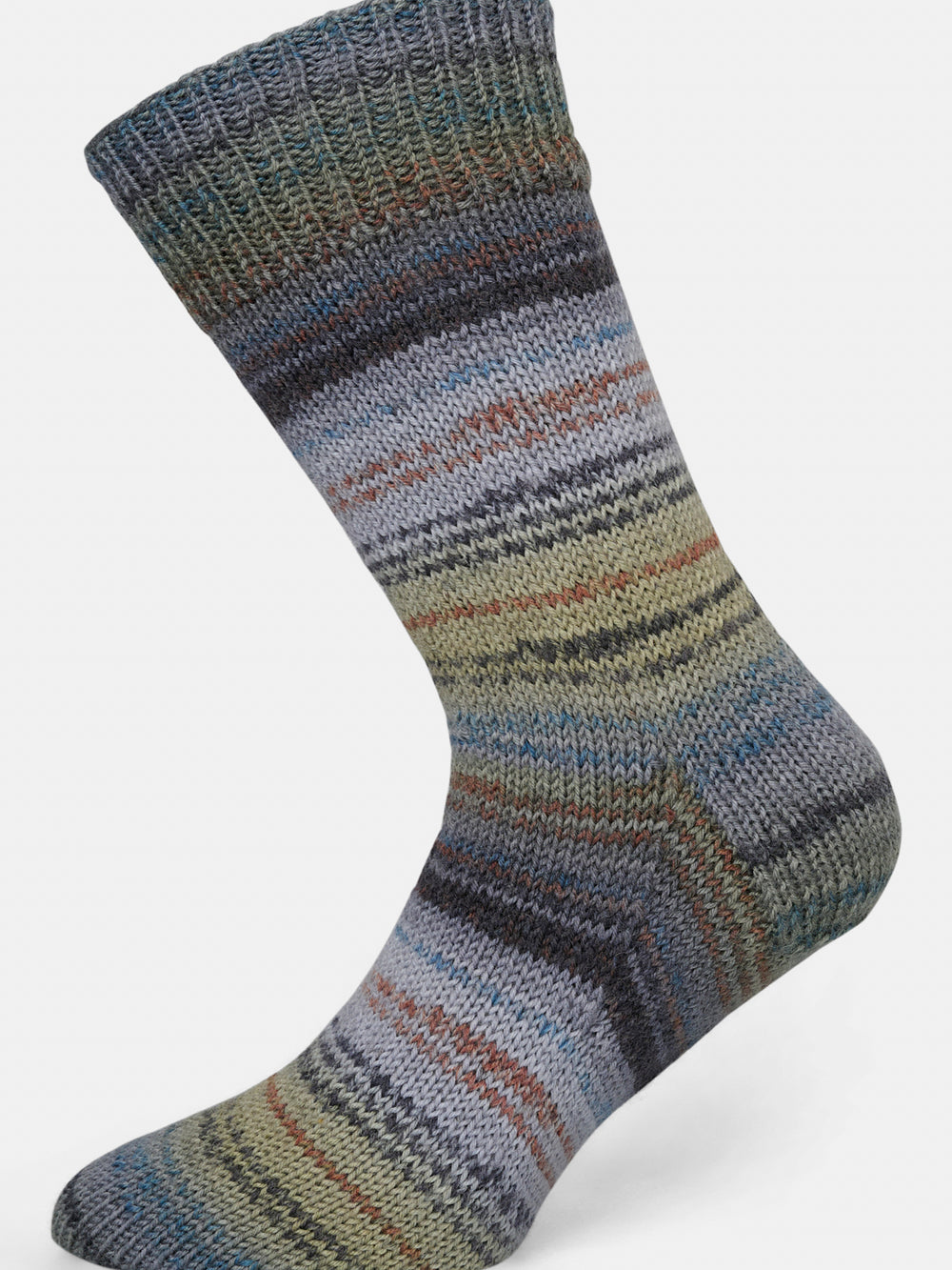 Mit diesem Garn erhalten Sie garantiert wunderbar warme Socken, die jahrelang halten, da das Garn mit langen Fasern gesponnen wird, um die Haltbarkeit zu erhöhen. Das Druckmuster der Serie Valley sorgt dafür, dass die Socken ein feines Muster in schönen, aufeinander abgestimmten Farben haben.