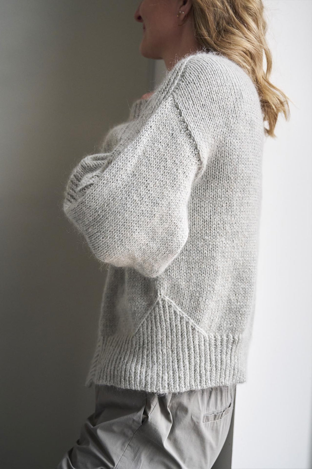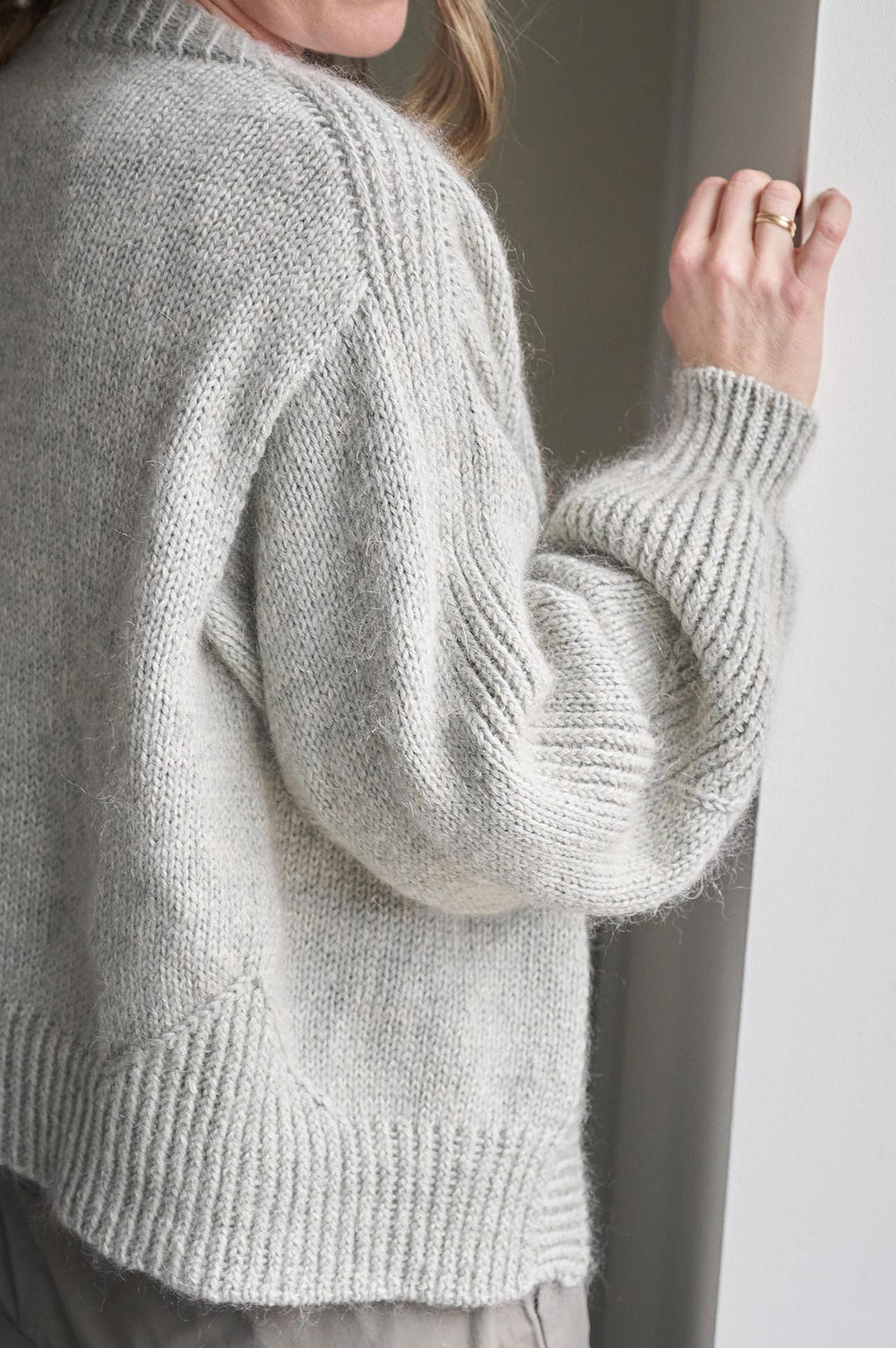 Im Schulterbereich werden Zunahmen gestrickt, während das Rippenmuster entlang der Ärmel weiterläuft und einen schönen Kontrast zum Rest des Cardigans bildet, der in glatt rechts gestrickt wird. Am Ende der Ärmel wird das Rippenmuster allmählich erweitert, was zu einem hübschen, dreieckigen Rippenmuster führt, das den Rebild-Cardigan von anderen Strickjacken abhebt. Die Ärmel haben einen schönen Balloneffekt. Dasselbe dreieckige Rippenmuster wird auch am unteren Rand des Cardigans gestrickt, was nicht nur für ein harmonisches Gesamtbild sorgt, sondern auch einen besonders schönen und detaillierten Abschluss bietet. Zum Schluss wird der Cardigan mit großen Knöpfen nach Wahl versehen.