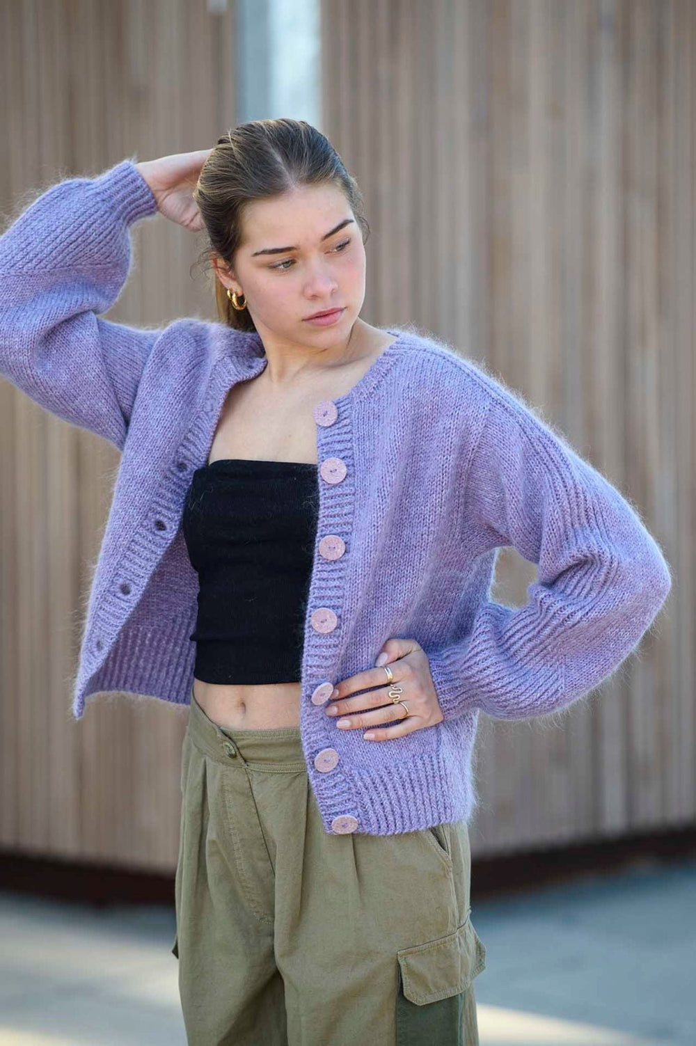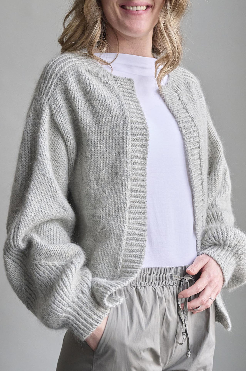 Die kuschelige und weiche Fülle des Rebild-Cardigans kommt vom verwendeten Garn, denn er wird mit einem Faden Mayflower Easy Care Classic und einem Faden Mayflower Super Kid Silk gestrickt.