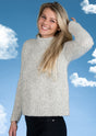 Ein einfacher Pullover, der im luftigen Mayflower -Himmel gestrickt ist, der aus Wolle, Alpaka und Polyamid besteht.